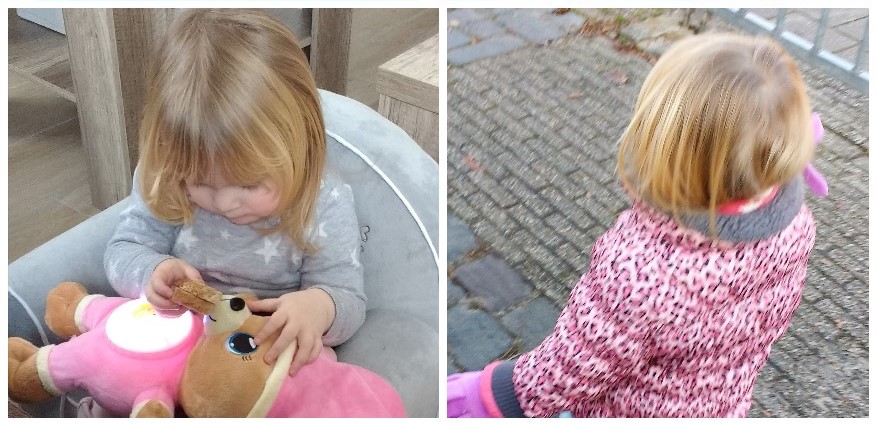 Een snelle boterham voordat Noor naar het kinderdagverblijf ging, zat er niet in. Beer moest namelijk ook eten. Pfff, wat vind ik dat altijd een uitdaging: ’s ochtends op tijd de deur uit met die twee! Omg! Noor gaat op donderdag altijd een halve dag naar de opvang (de ochtend dus) en ik kan haar tussen half 8 en 9 uur brengen. Ik breng haar dus altijd om 09:05. Haha, nee hoor, of nou ja… Het kinderdagverblijf zit bij ons in de straat (ja, super chill!) dus ik loop echt altijd net voor 9 uur thuis weg. Eerder vind ik echt niet te doen in m’n eentje terwijl Lot ook nog een fles moet, en een geluk: ik heb op donderdag nog ouderschapsverlof dus ik hoef nergens heen. Wat dat betreft was deze ochtend niet echt anders want papa is normaal werken.