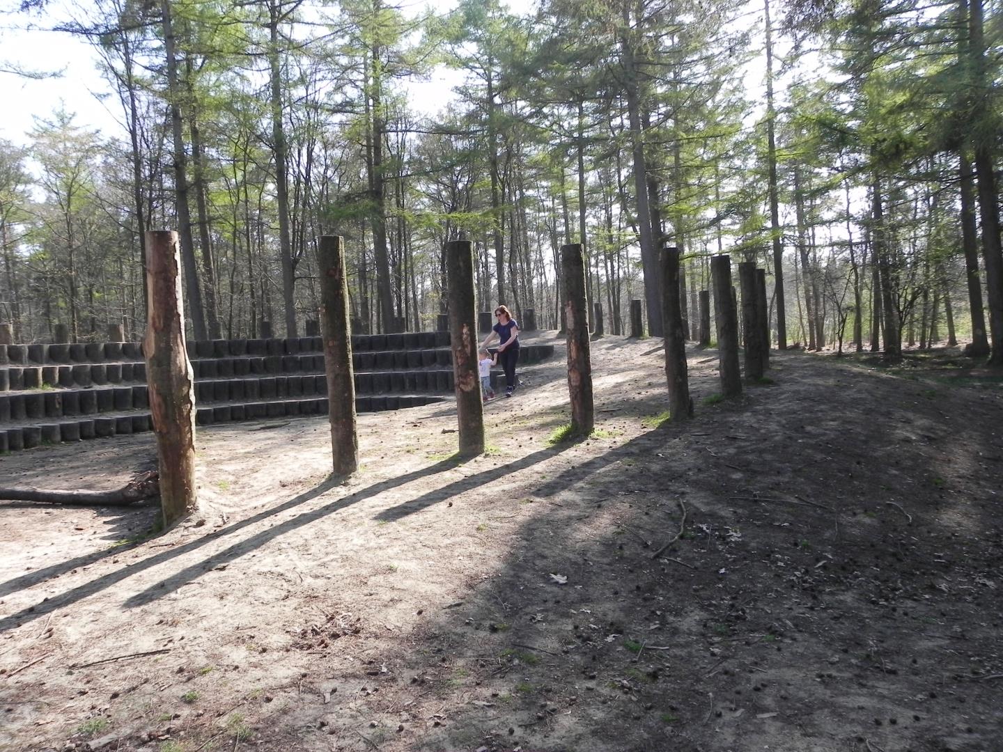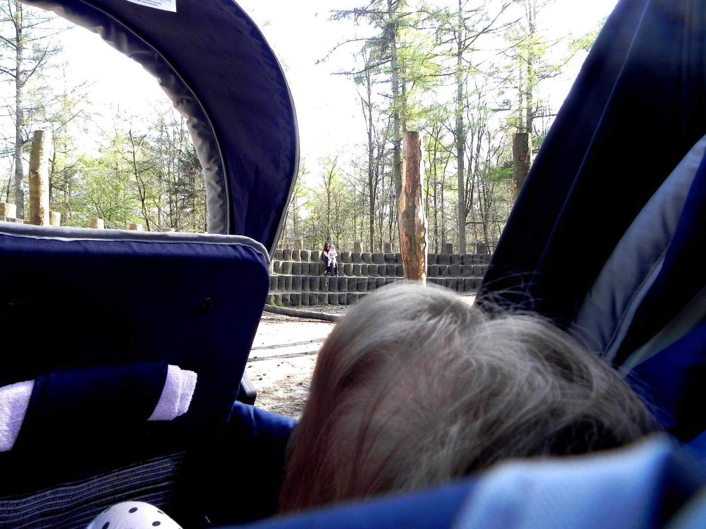 In het speelbos heb je allerlei klim- en klauterdingen voor kinderen en voor veel dingen is Noor nog een beetje klein, maar op deze blokken lopen was natuurlijk wel heel leuk… Lot chillt nog even verder zoals je ziet 🙂