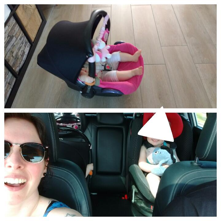 Na het ontbijt: spulletjes pakken en de meiden klaar voor vertrek maken. In de auto maakte we gezellig een foto. Ik hoor je trouwens denken: “Waarom gingen jullie met dat belachelijke warme weer naar de Efteling?”. Dat kan ik uitleggen: ik had de dag ervoor (zaterdag) gewerkt en toen was het dus net zo warm, maar super rustig in het park. Heh heh. Dat zou dan de dag erna ook zo zijn! In de ochtend zou het grotendeels bewolkt zijn, en dat was ook zo, waardoor het in de ochtend in ieder geval lekker koel was.