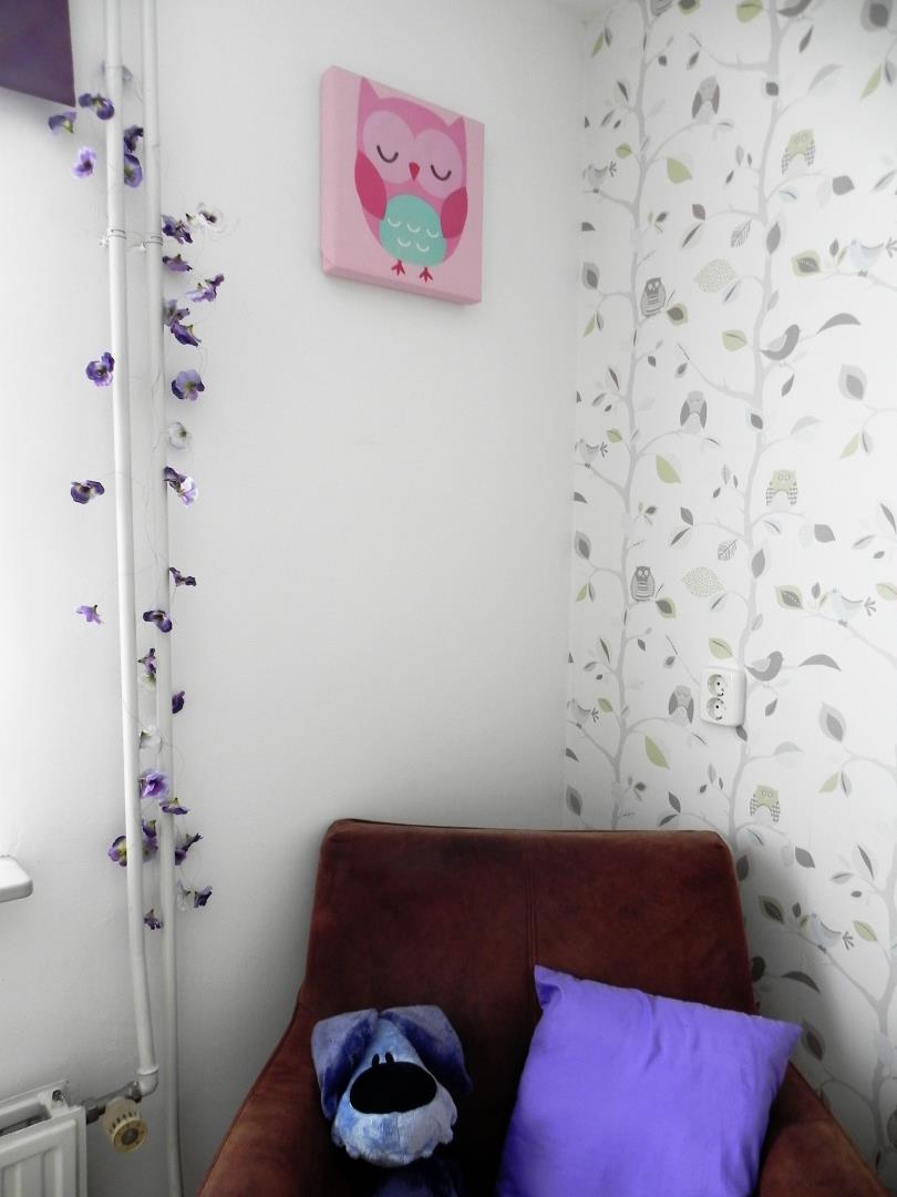 Boven de stoel hang een uil. Die had ik al voordat ik het behang had want in ons oude huis, hing ‘ie op Noor haar kamer. De uil voelde zich hier uitermate thuis, dus ik heb ‘m bij Lot weggehangen. Om de -nogal lelijke- verwarmingsbuizen heb ik een paarse bloemenslinger heen gedrapeerd, die met het kussen en het paarse rolgordijn (Ikea) matched.
