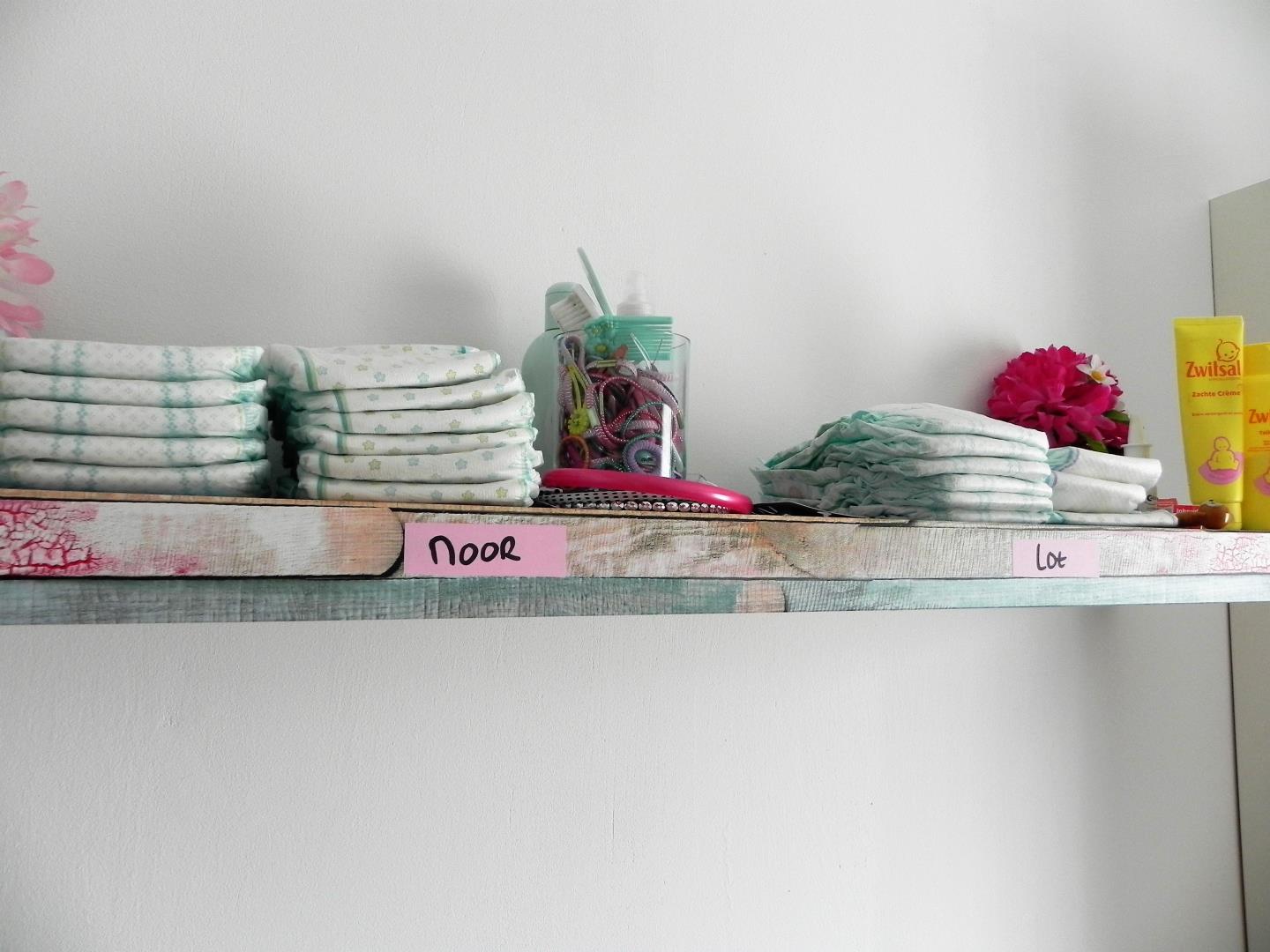 Met erboven een plank voor de luiers. We verschonen Noor ook gewoon hier want anders moesten we de commode op de overloop zetten. Past makkelijk, maar dat vond ik zo stom staan, haha. Gelukkig is Noor nu bijna luier-af (alleen ’s nachts nog!) en ging het verschonen op Lot haar kamer ook prima! De plank is trouwens een oude, donkere Ikea plank die ik beplakte met folie van Hornbach. De stickers met de namen erop zijn de bovenkantjes van Post-it papiertjes, zo trek je de folie niet kapot.