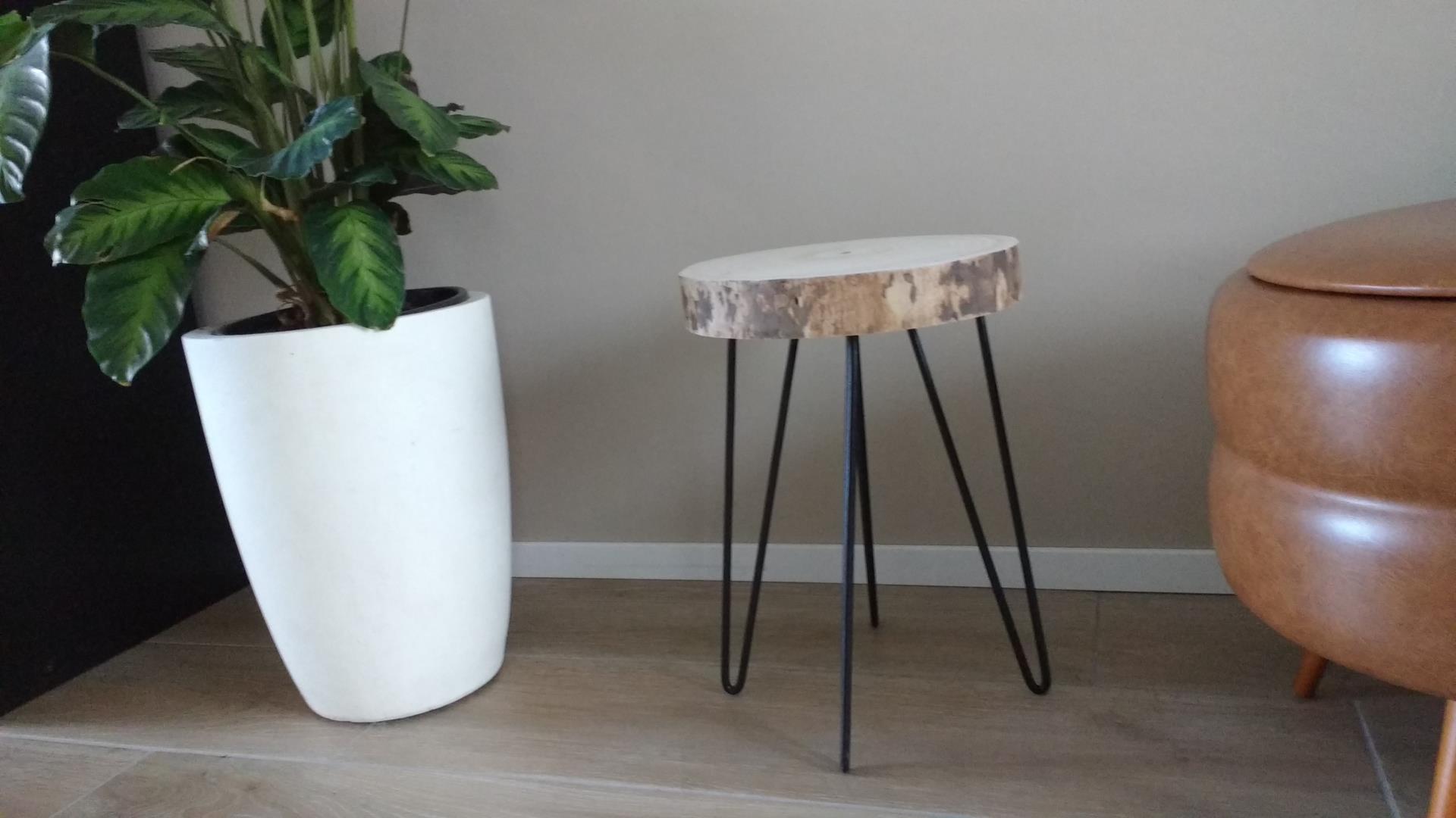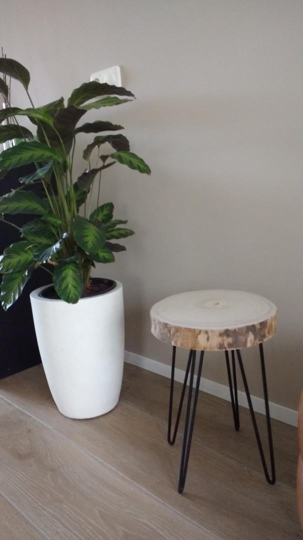 Nu de box weg is, moest en zou er zo’n boomstamachtig bijzettafeltje komen! Hij staat goed daar tussen mijn vtwonen plant en de bruine poef uit de jaren zeventig. Die poef is van mijn moeder geweest maar mijn nieuwe aanwinst kocht ik gewoon online bij Xenos.nl!