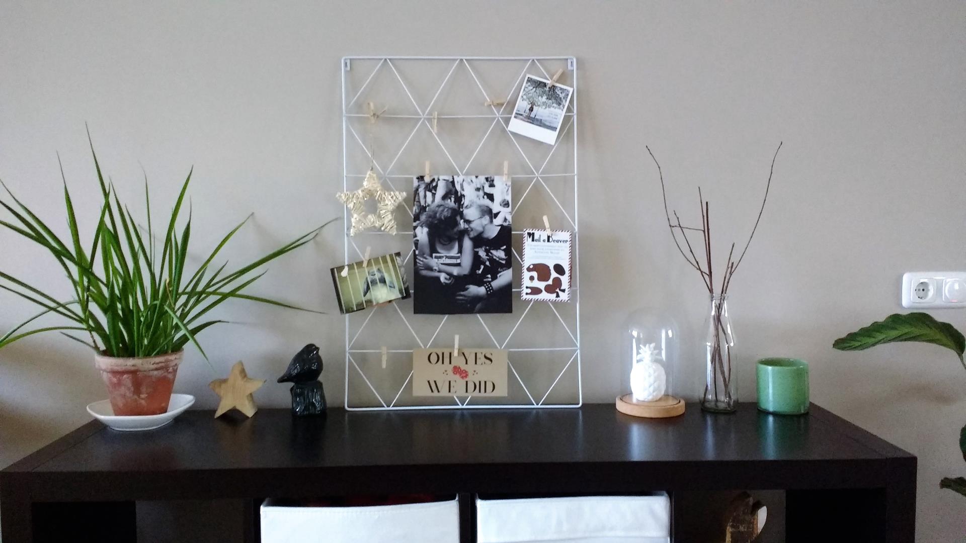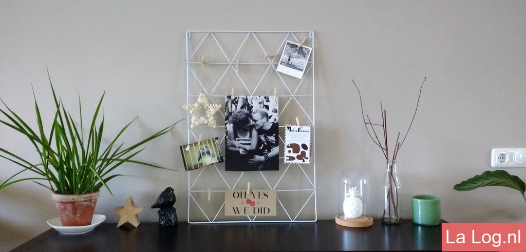 Love this! Toen ik dat krukje online shopte zag ik per ongeluk dit leuke raster memobord dat voor zeven euro te koop was, haha, hebben! Zo leuk om dit steeds weer opnieuw in te richten! Inmiddels heb ik er ook een lichtslinger aan gehangen, zo gezellig in de donkere avonden 🙂