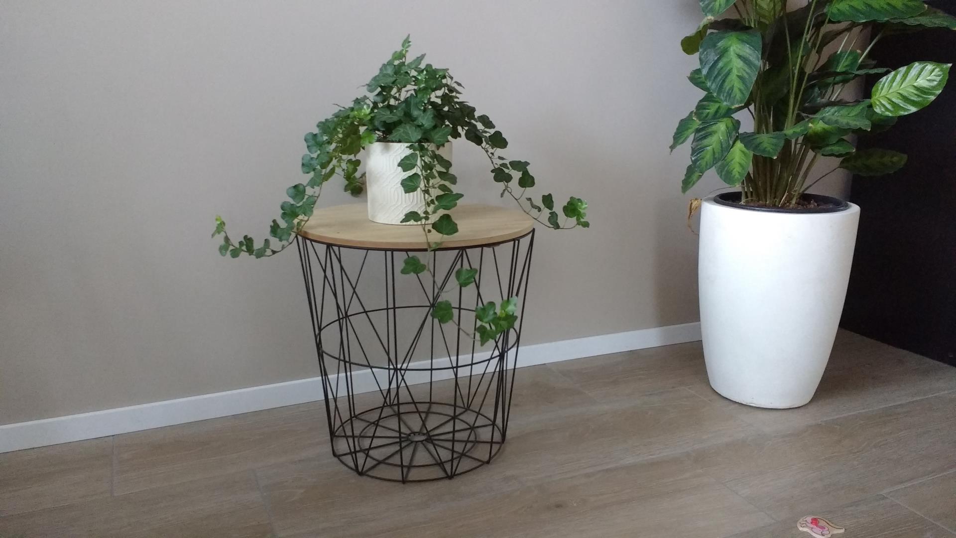 Aan de andere kant van de kast zette ik dit bijzettafeltje. Ik had ‘m al een hele tijd maar kon er steeds geen goede plek voor vinden. Er staat inmiddels redelijk wat groen in huis en de klimop in het witte potje maakt het af. Deze bijzettafel kreeg ik trouwens vorig jaar in mijn kerstpakket 😀 Tof he?