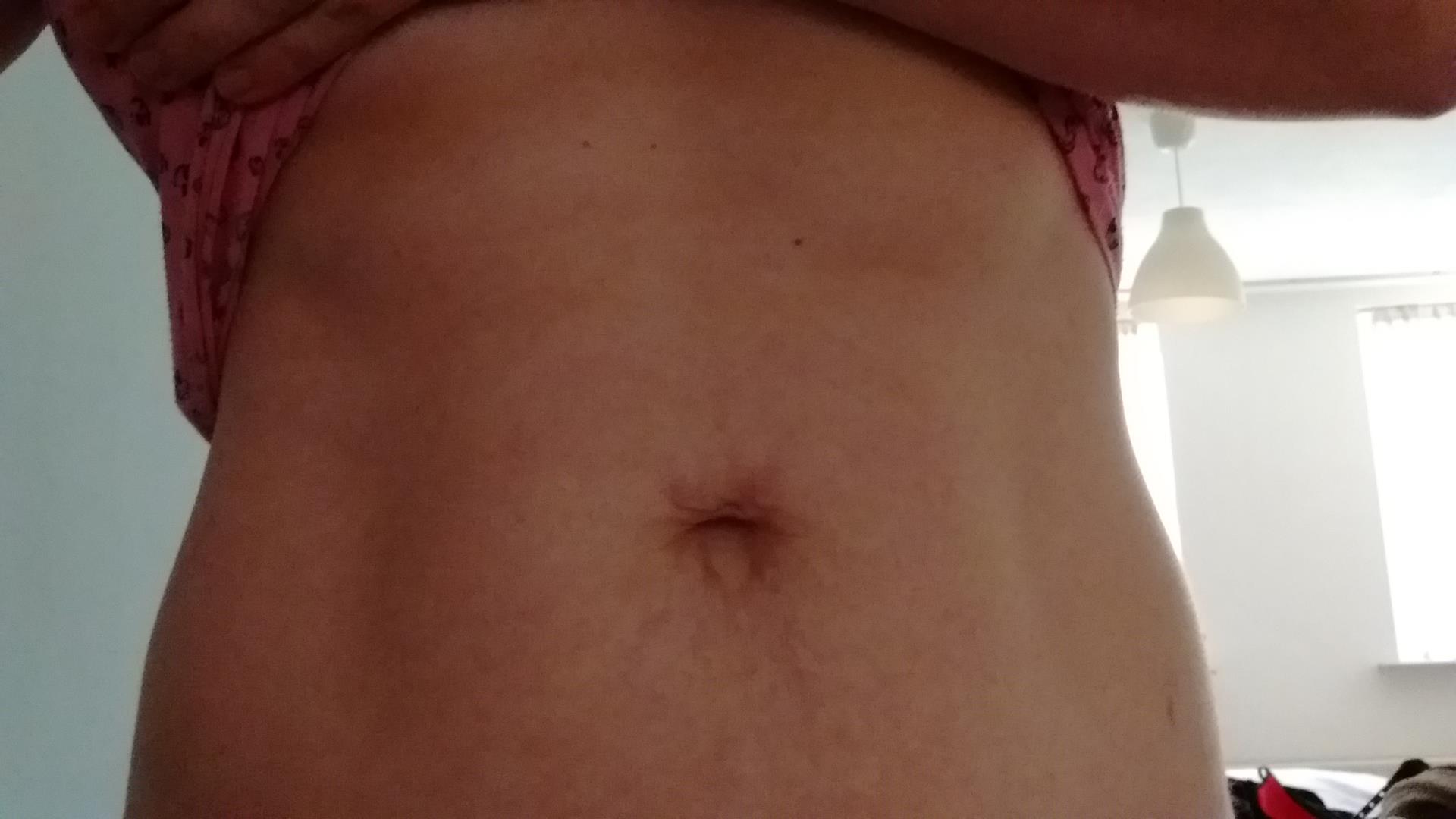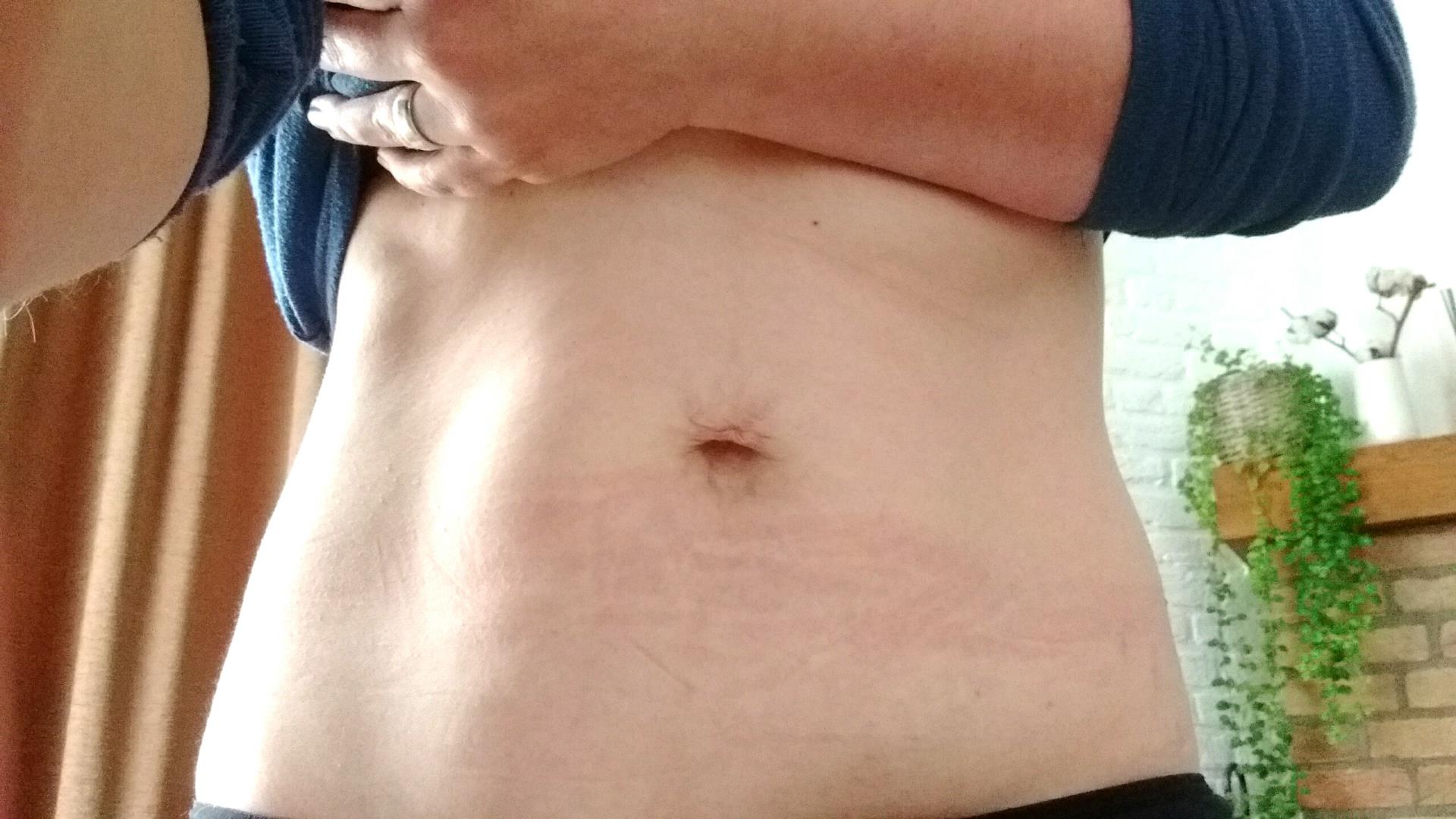 Nou weet ik ook wel dat de striae wel meevalt bij mij, maar voor mijn zwangerschappen zat er niks dus mijn lijf is wel veranderd. Wat ik overigens helemaal niet zo erg vind hoor, maar ik was wel heel benieuwd wat deze Bio-oil zou doen. Ik ben anderhalf jaar geleden bevallen van mijn tweede meisje en zelfs nu heeft het nog zin om te smeren! Ik heb de na-foto in het volle licht gemaakt want ik moet gewoon goed kijken waar de striemen nu nog zitten… (de rand van mijn broek zie je trouwens wel lopen omdat ik had gezeten, haha)