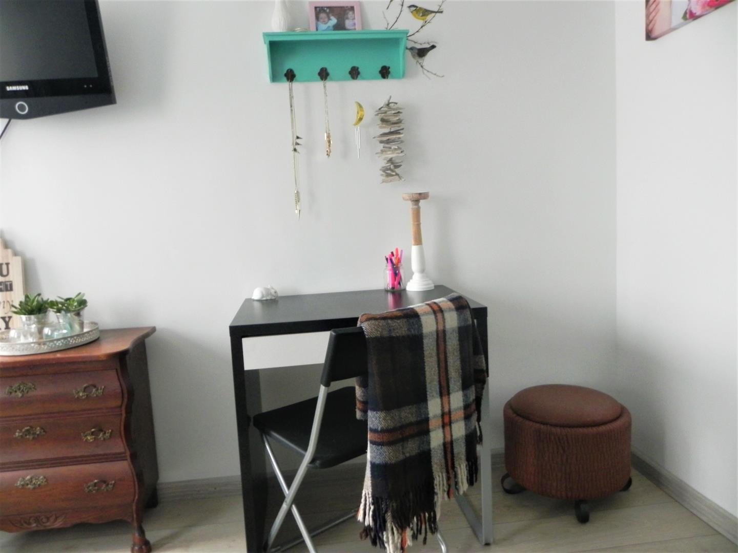 Tegenover ons bed vindt je dit gezellige tafereeltje! Jammer van die zwarte snoeren onder de tv, I know, haha. Onder de tv staat het buikkastje dat van mijn oma is geweest en daarnaast zie je mijn blogplekje. De caféstoel helemaal links komt nog uit mijn ouderlijk huis en is opgeknapt door mijn vader, zo leuk!