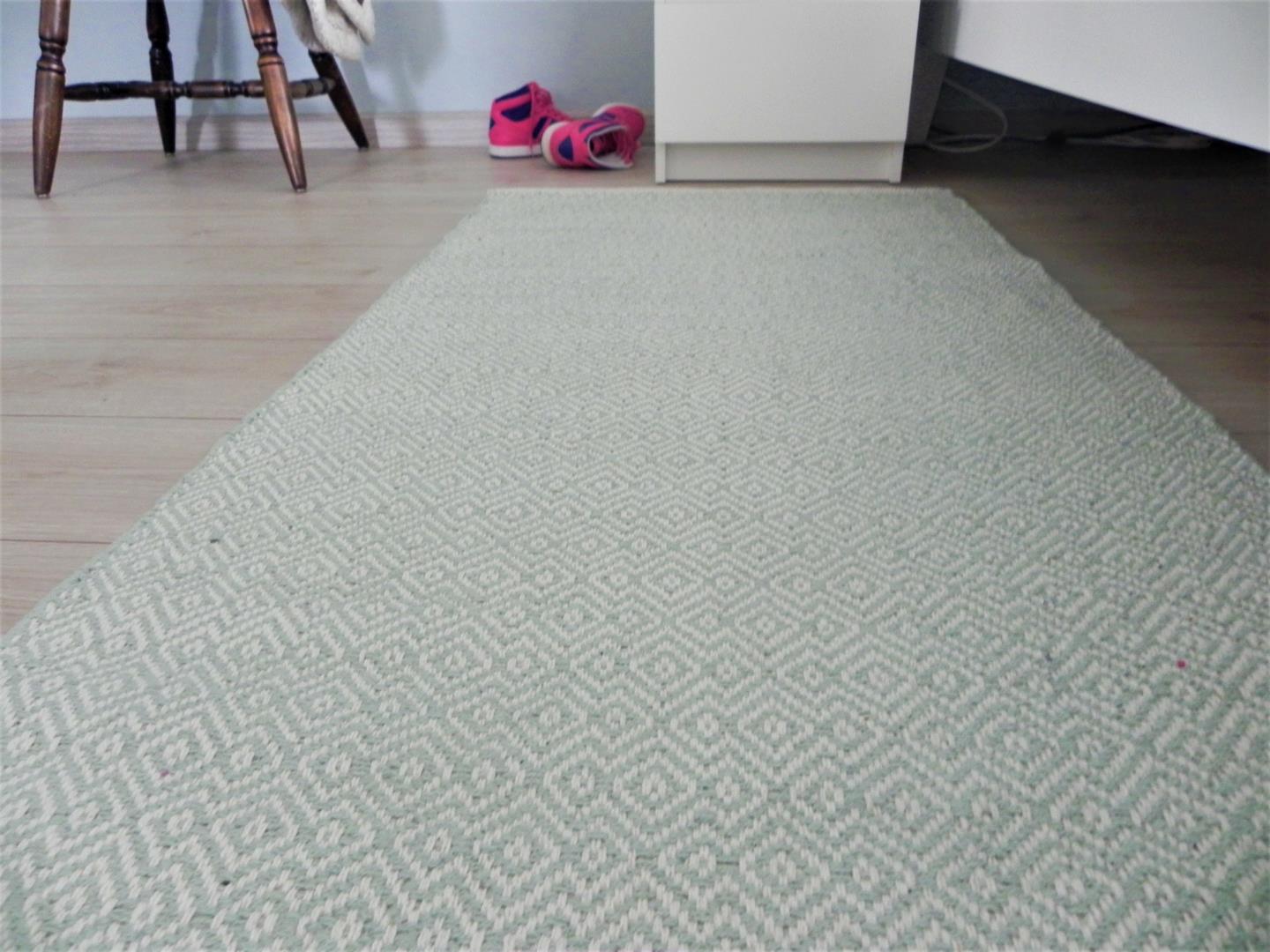 Het mintgroene kleed naast het bed is van Kidsdepot en bestelde ik laatst bij Wehkamp.nl. Hij past perfect bij de muur en de witte meubels.