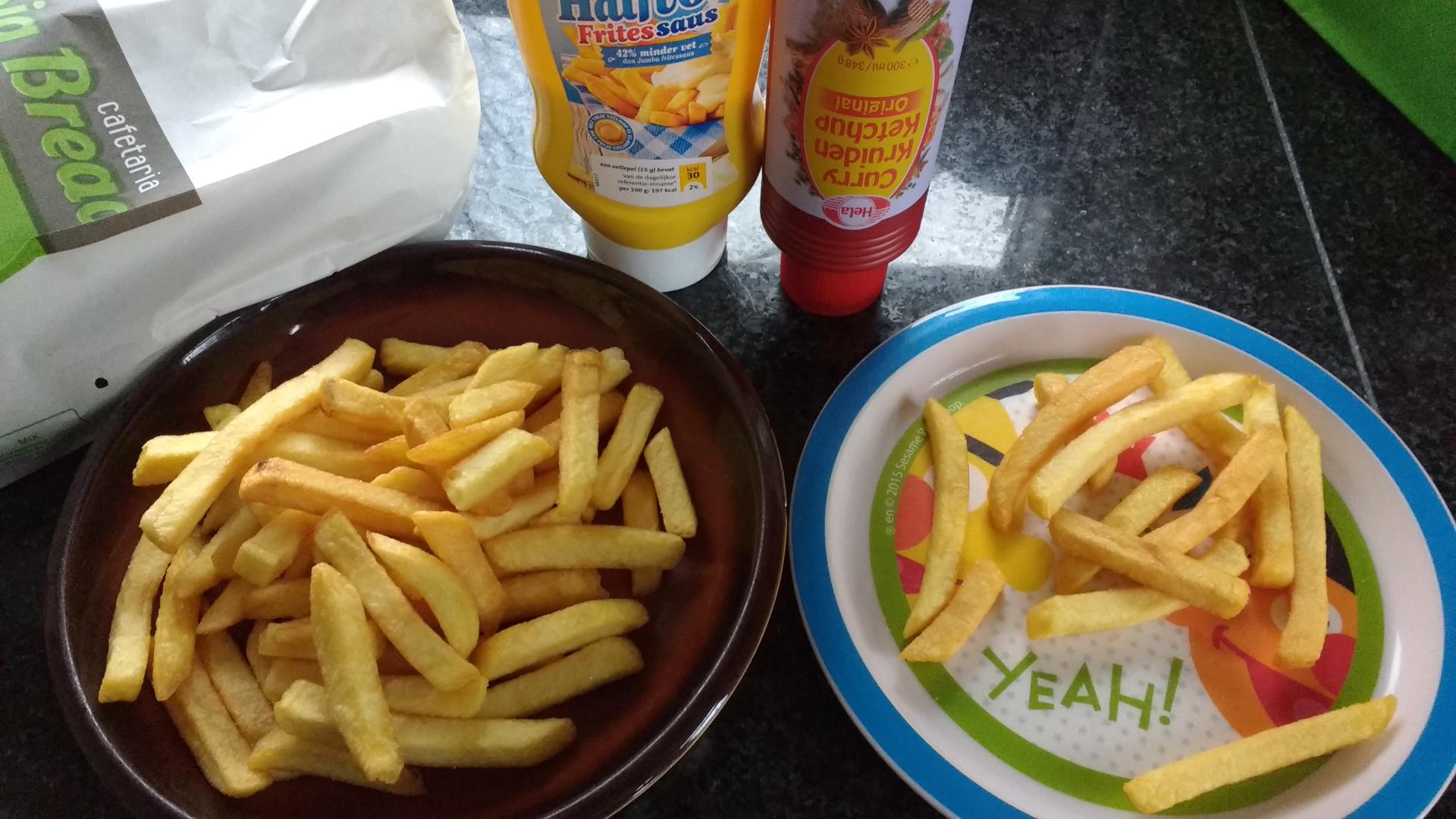 Daarna werd het frietjes eten. Noor mocht kiezen wat en waar we gingen eten en dat werd thuis op de bank met een bord friet op schoot. Niks geen pannenkoekenrestaurant (!) wat ik wel jammer vond, maar hier wordt Noor gewoon echt heel blij van: lekker thuis met frietjes erbij.