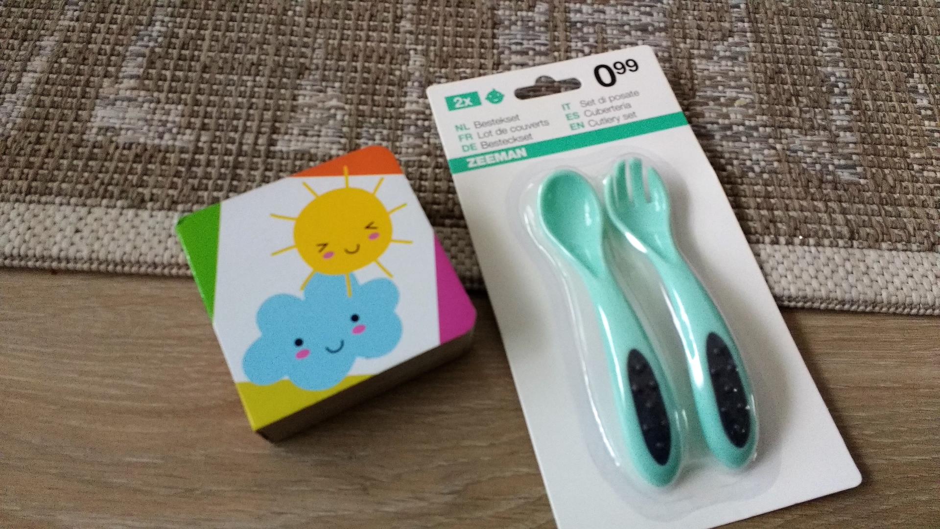 Kleine Lot was met me mee dus ze kreeg een lief boekje. Ze is echt gek op boekjes “lezen” en bladeren. Het bestek setje kwam ik toevallig tegen en kunnen we wel gebruiken.