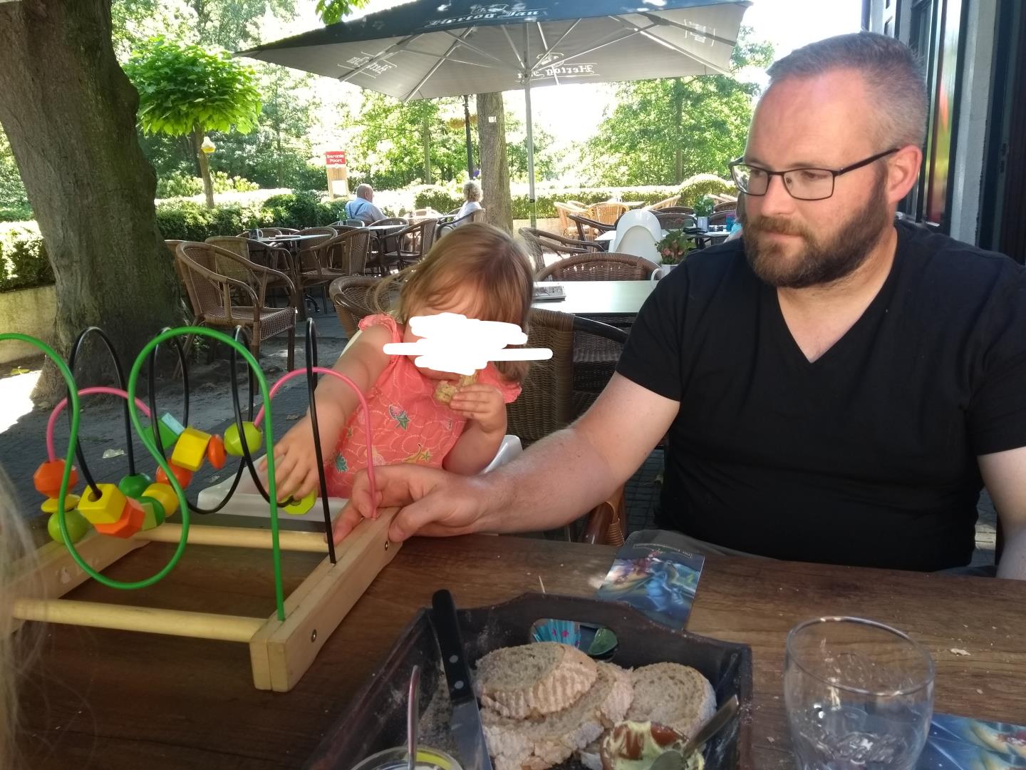 Na het bezoek aan de Avri gingen we naar pannenkoekenrestaurant Koeckers in Den Hout, waar we gereserveerd hadden. Vooraf namen we stokbrood met smeersels en hoewel husband niet echt vrolijk kijkt, was ie het wel hoor, haha 😉