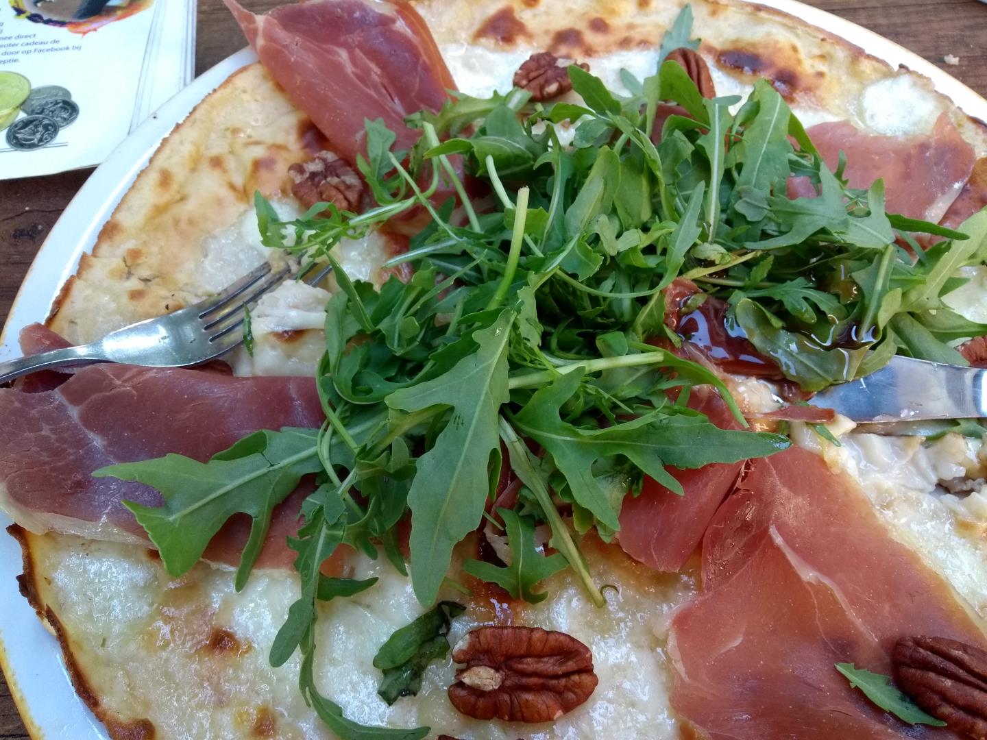 En ik een heerlijke pannenkoek met parmaham, mozzarella, walnoten, rucola sla en balsamico dressing. Zo lekker!