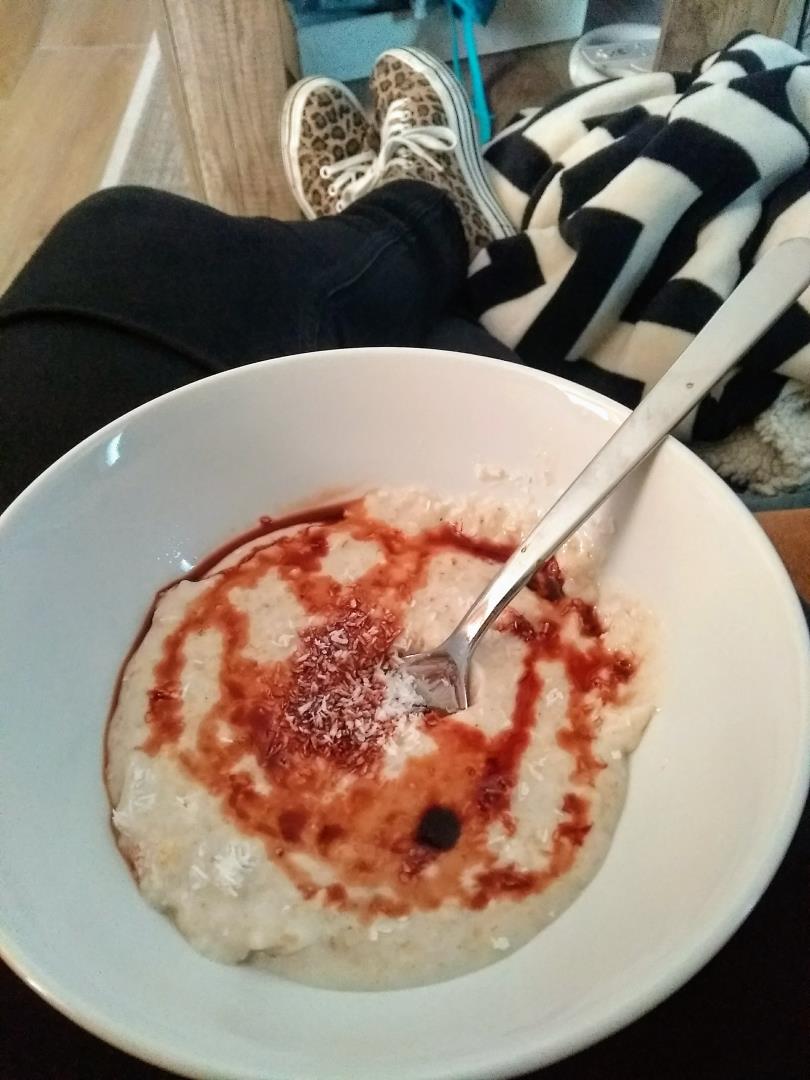 Mijn favoriete ontbijt! Ik neem 200 ml amandelmelk en doe daar 5 eetlepels glutenvrije havermout bij. Ik breng dit al roerend aan de kook en laat het zo’n drie minuutjes pruttelen. Daarna doe ik het in een kom en roer er wat kokosrasp doorheen. Als laatste gaat er een beetje dadelstroop overheen. Zo lekker!