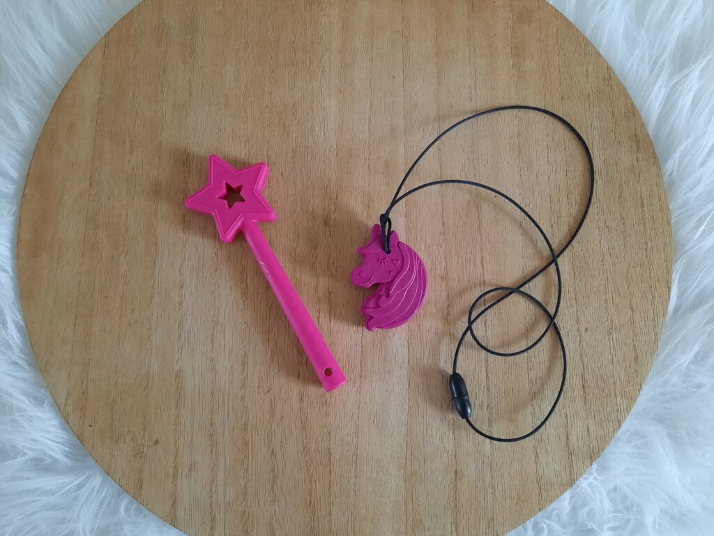 Sinds een tijdje gebruikt Lot nu twee kauwsieraden: de Fairy Princes Star Wand en de bijtketting Chewnicorn. Omdat zij s’nachts tandenknarst is het heel moeilijk te bepalen wat het effect ervan is, maar om de spanning in haar kaken te verminderen en daarmee ook de kans op het knarsetanden, laten we haar tijdens het lezen van haar boekjes lekker kauwen op één van haar kauwsieraden.