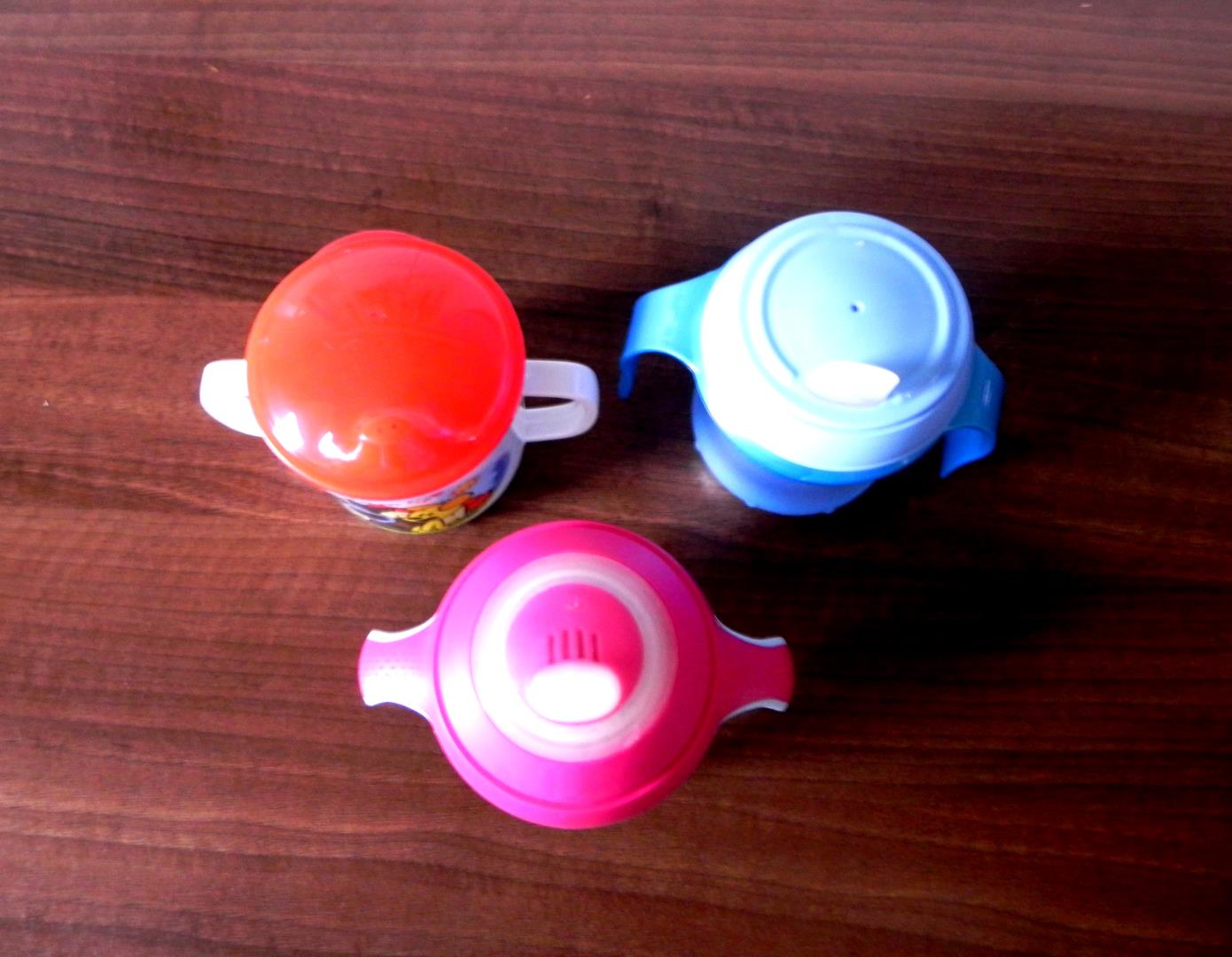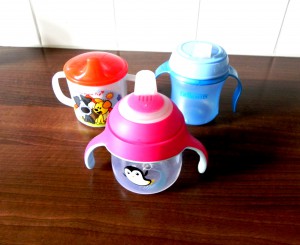 Het lijkt goed te gaan met exemplaar nummer twee: Noor drinkt goed en hij lekt niet. Maar wat is dat geluid toch? O, ja dat was het…Tuitbeker nummer twee klinkt als een beademingsapparaat en het water komt er met veel belletjes uit. Ik pak de beker, draai ‘m open en haal het anti-lek-lucht-whatever-systeem uit elkaar. Noor graait naar alle onderdelen want mevrouw zit inmiddels op schoot. Ik zie niks geks, zet ‘m opnieuw in elkaar en geef Noor de beker. Weer dat beademingsapparaat! Aaaah, ik word gek van die stomme bekers! Zal ik tuitbeker nummer vier dan maar uit z’n verpakking gaan halen? (Want ja; die heb ik!) Ik zet Noor in de box en loop met m’n roosvicee-walm weer naar de keuken, vul een gewoon flesje met water en geef ‘m aan haar. Zo. Dan leert ze maar wat later drinken uit een beker.