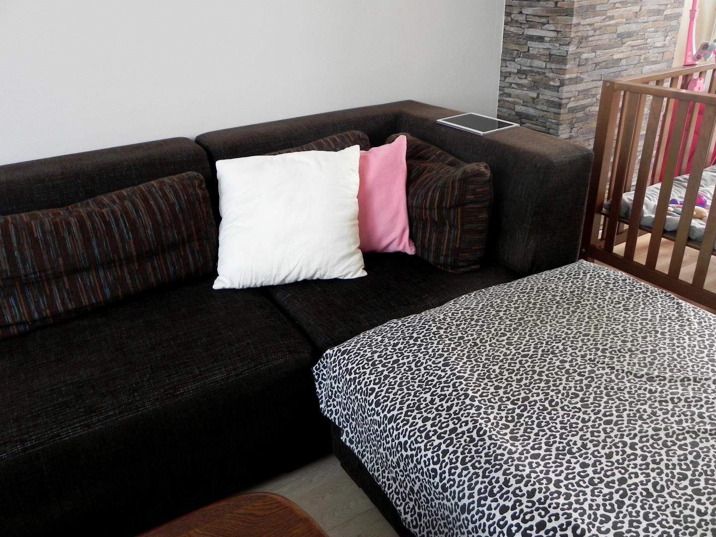 Storm heeft zijn eigen plek op de bank. Een mooi kleed mag daar niet ontbreken. Met printje natuurlijk 😉