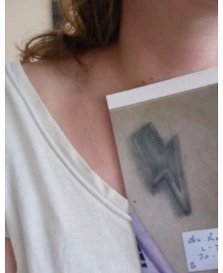 Het kwam zo: Wim heeft een tattoo op zijn linkerarm waarin bliksemschichten verwerkt zitten. Het leek mij daarom leuk om een kleine bliksemschicht net onder mijn sleutelbeen te laten zetten zodat we iets hadden dat bij elkaar hoorde. Ik ging met mijn idee naar de tattoo shop waar ik mijn andere tattoo’s ook had laten zetten. Iemand die daar pas werkte ging ‘m zetten en ik vond het prima. Het is een vooraanstaande tattoo shop in Breda en ik vertrouwde erop dat ze niet zomaar iemand achter die naald zetten.