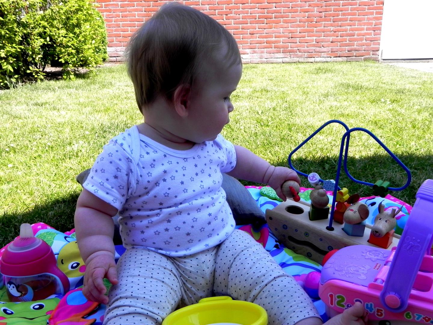 En dan nog zoiets: die antenne die altijd op scherp staat! Whaaat? Kan die ook uit? Niet hè? Het gaat altijd zo in mijn hoofd: Waar is ze? Wat doet ze? Huilt ze nou? Pas op, straks valt ze nog! Heeft ze genoeg gedronken? Heeft ze honger? Wat is die rode plek nou ineens? En dat gaat zo nog wel even door. Lucky me, dat ze meestal bij me is want dan weet ik alles van waar, wat, huilen, vallen, drinken, eten en rode plekken. Maar ook al zit ze op het speelkleed in de kamer, pakweg zo’n twee meter bij mij vandaan, dan nog hè! Dan sta ik nog op scherp. Vermoeiend. Zal wel zo’n typische mama-eigenschap zijn. Hoe cliché.