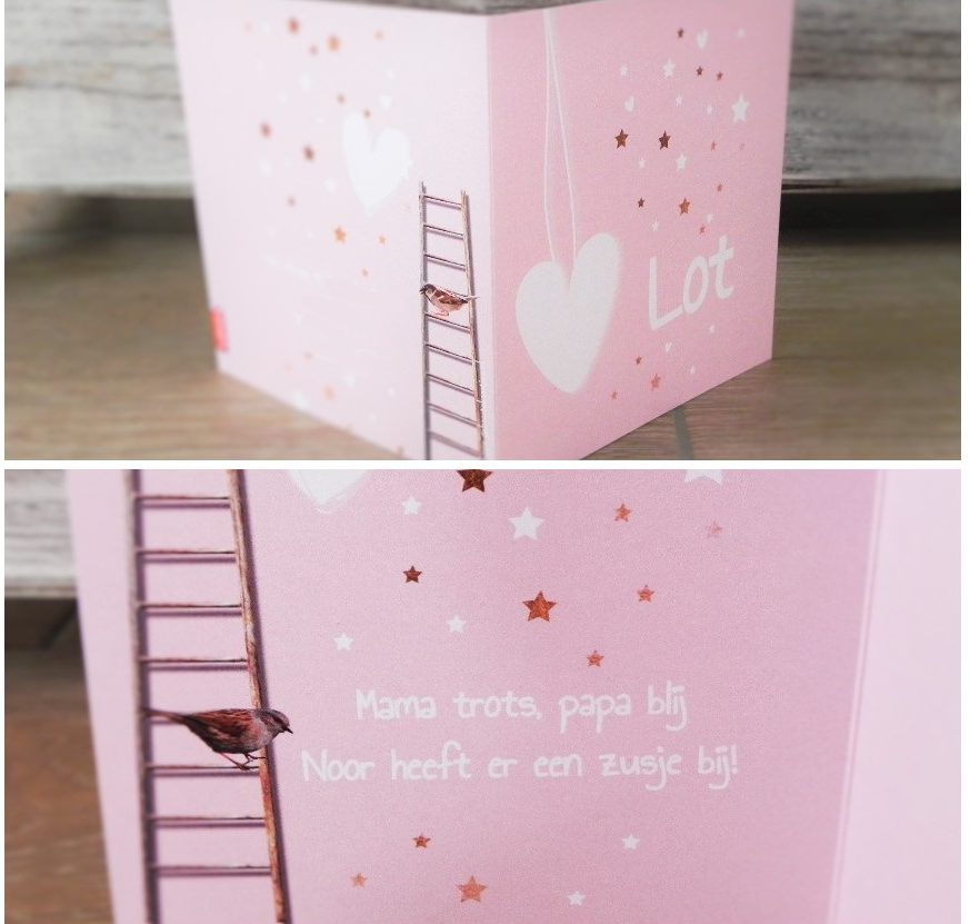 Afgelopen donderdag kregen we ze binnen: de geboortekaartjes van Lot! Ons tweede meisje is vorige week maandag geboren en het kaartje hadden we allang in de startblokken staan. Of het moeilijk was om een keuze te maken tussen al die kaartjes die je om de zwangere oren vliegen? Voor ons niet. Ik had al een idee in mijn hoofd en werkte dit uit. Het resultaat zie je hier!