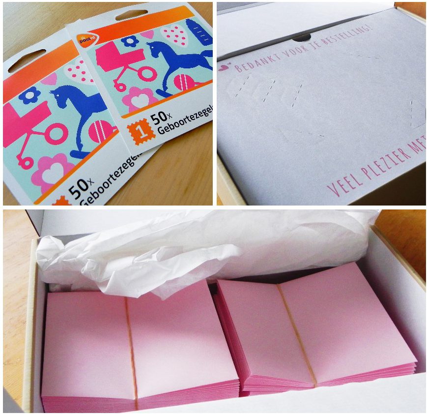 Deze keer ontwierp ik dus het geboortekaartje bij hippegeboortekaartjes.nl waar je je kaartje super makkelijk helemaal zelf kunt samenstellen. Gelukkig maar want ik ben daar een ei in. Wat ik ook deed was de enveloppen vooruit bestellen. Ideaal. Zo zat ik dus met een hoogzwangere buik op de bank alle enveloppen alvast verzendklaar te maken zodat we vorige week alleen nog maar de kaartjes erin hoefde te doen.