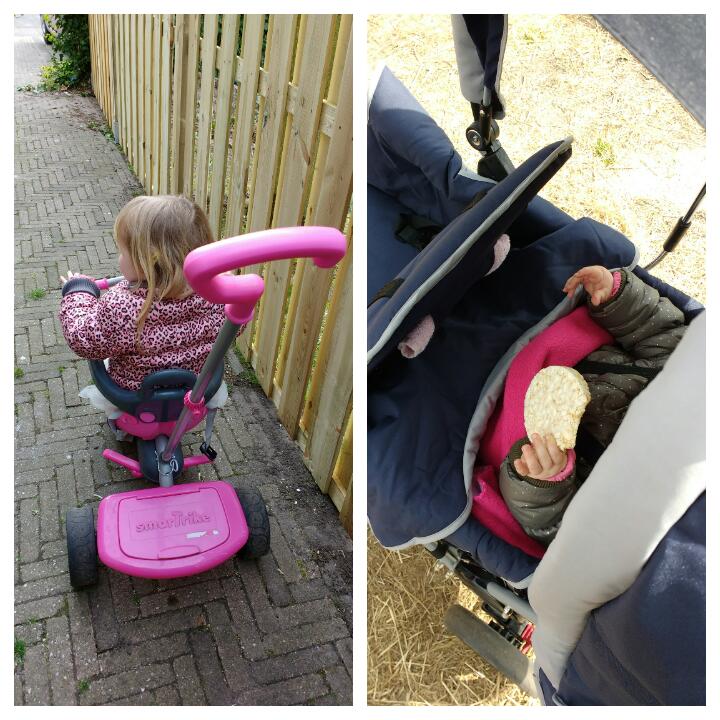 Toen ik Noor uit bed haalde merkte ik meteen al dat ze niet helemaal lekker was; hangerig en een beetje warm… Dus we gingen lekker naar buiten om een frisse neus te halen. Lot kreeg een rijstwafel mee, die eet ze sinds vorige week zelf zo op. Handig!