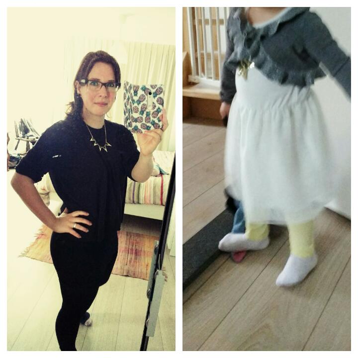 Mijn outfit die dag! Ik show niet vaak outfits want if it ain’t black, it’s going back, haha. Heel spannend is het eigenlijk nooit, maar dit setje is nieuw (en enig!) dus ik dacht ach… even een outfit-foto. Dat zag Noor en er moest toen natuurlijk ook een foto van haar jurk gemaakt worden! De slechtste foto ooit, I know, maar ze stond niet stil en na foto nummer 6 vond ik het wel best, haha.