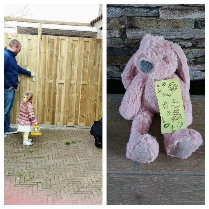 Op naar opa en oma voor paaseieren! Links op de foto gingen we net van huis en zie je onze nieuwe schutting en poort die Wim afgelopen week zelf gemaakt heeft. Noor vond het heel interessant want er stond normaal niks om dat stuk tuin heen. Door de vorige bewoners werd de grond naast het huis gehuurd en wij kregen 2 weken terug akkoord om het te kopen dus toen kwam die schutting er ineens heel snel natuurlijk, zo fijn! Rechts het cadeau voor Noor en Lot wat bij mijn ouders klaar stond, dat vond ik echt heel lief! Noor heeft een lichtbruin exemplaar en Lot deze roze.