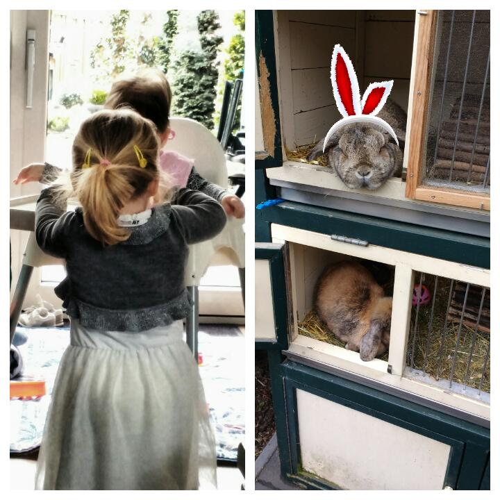 Noor kwam haar zusje nog even helpen met de boterham en daarna: naar buiten voor de paaseitjes. De konijnen van mijn moeder (rechts) hadden ze goed verstopt, haha, flauw.