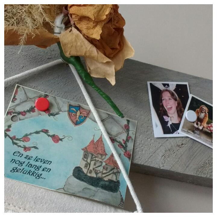 Overal in huis vindt je dingen terug van onze bruiloft! Ik vind het heerlijk om erbij weg te dromen 🙂 Hierboven zie je het kaartje wat bij de give-aways zat voor onze gasten van het feest en daarboven hangt de gedroogde corsage van Wim. Ernaast zie je trouwens twee foto’tjes van ons vrijgezellenfeest, haha.
