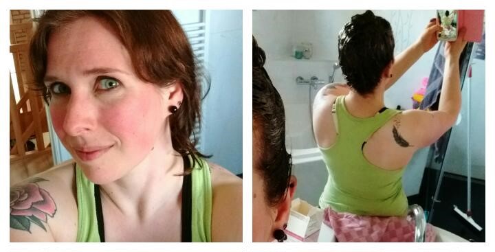 Oké, ik ging mijn haar kleuren en dat doe ik dus bijna nooit. Begin dit jaar gooide ik er een soort van kleurspoeling in die je er in een maand of drie weer uitwast. Die was een aantal tinten donkerder dan mijn eigen haarkleur en daar was ik heel blij mee! Nou was de spoeling er vrijwel helemaal uit en ik had nog een pakje thuisliggen. Wel een tintje donkerder dan de vorige (want die kon ik nergens meer vinden bij de Etos), maar hee, hoeveel zou dat nou uitmaken? Precies, niet zo veel. Dacht ik. Hehe. De foto links is voor het kleuren…