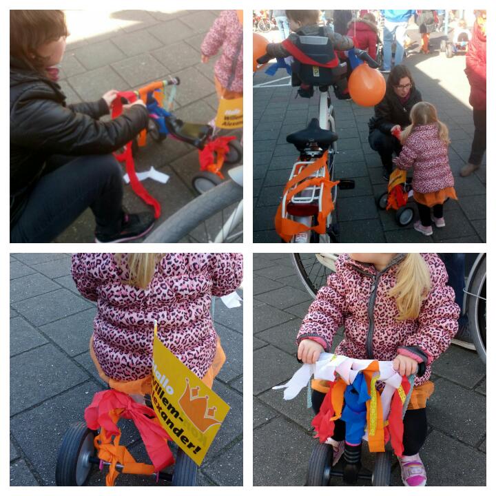 Het was Koningsdag dus we trokken er met Noor en Lot op uit om de fietsen te versieren. Noor met haar eigen loopfietsje en Lot zette we voorop in het kinderzitje van mijn fiets. Ze vond het prachtig om allemaal zo te zien! Gelukkig was het goed weer want de voorspellingen waren echt crap maar wij hebben geen druppel gezien.