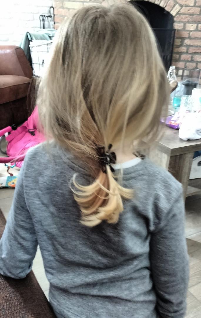 Nee, dit dan: mevrouw wilde net zo’n staart als mama, hahaha! Ik loop vaak met zo’n klem in, in het kader van lekker makkelijk, en Noor wilde er dus ook één!