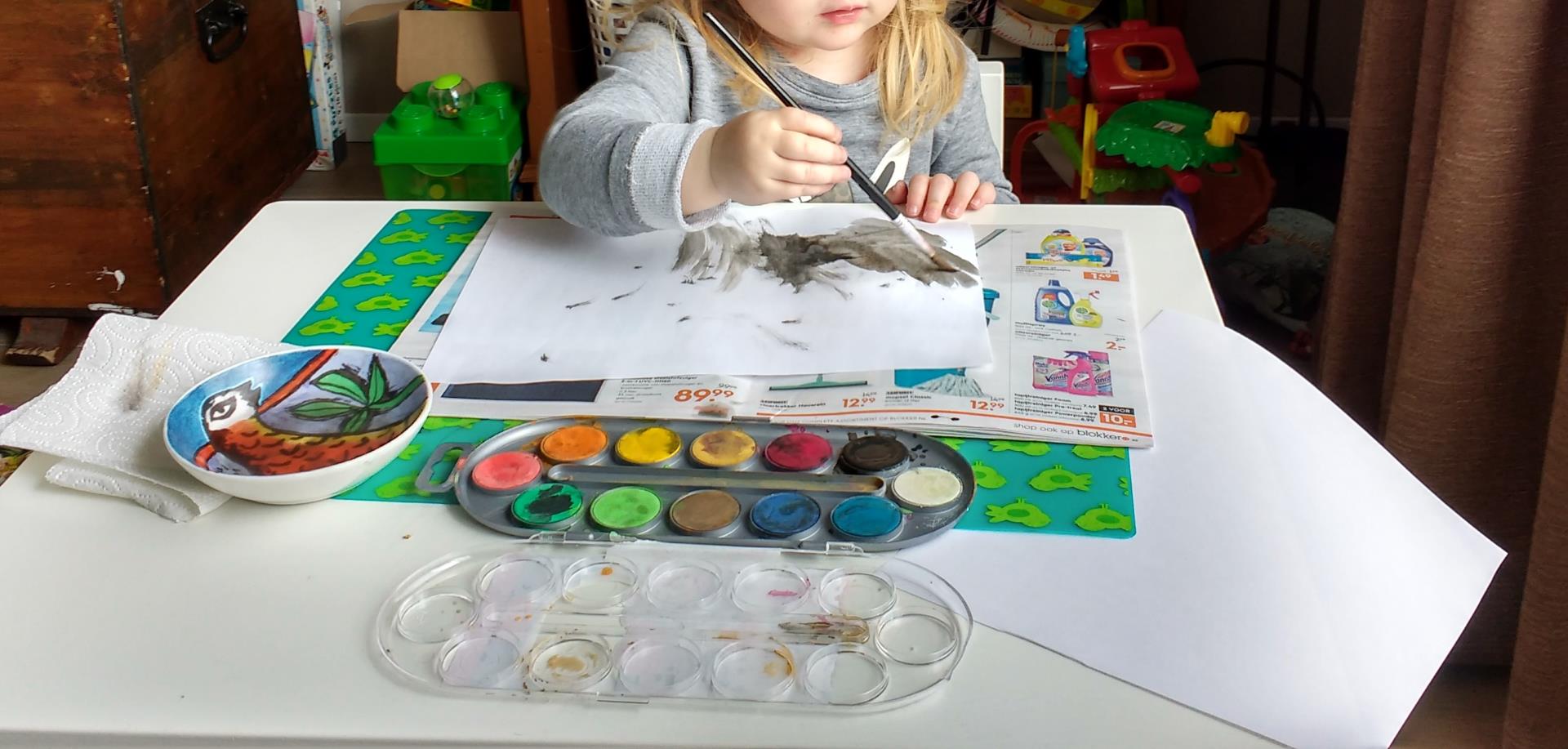 Later in de middag wilde ze gaan verven. Ik zette haar lekker aan haar eigen tafeltje, zo kon ze heerlijk haar gang gaan. Het is zo leuk om haar creaties steeds te zien! De klem was hier inmiddels weer uit nadat ‘ie twintig keer was uitgezakt, haha. ’s Avonds ging ik lekker sporten en deed ik een les Burn en Xcore en deed Wim het hele avondritueel met de kindjes.