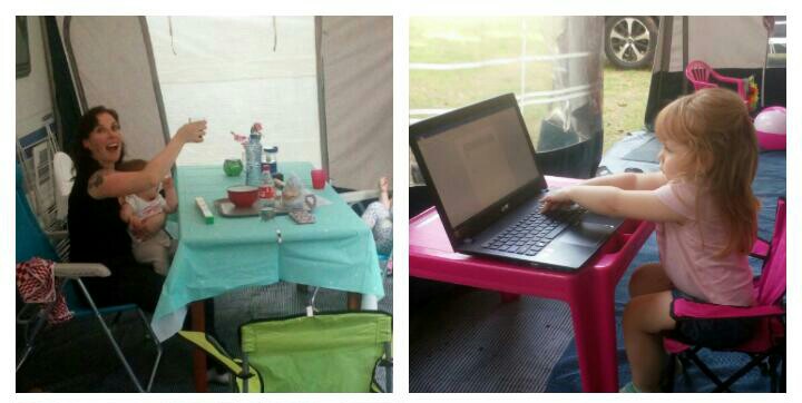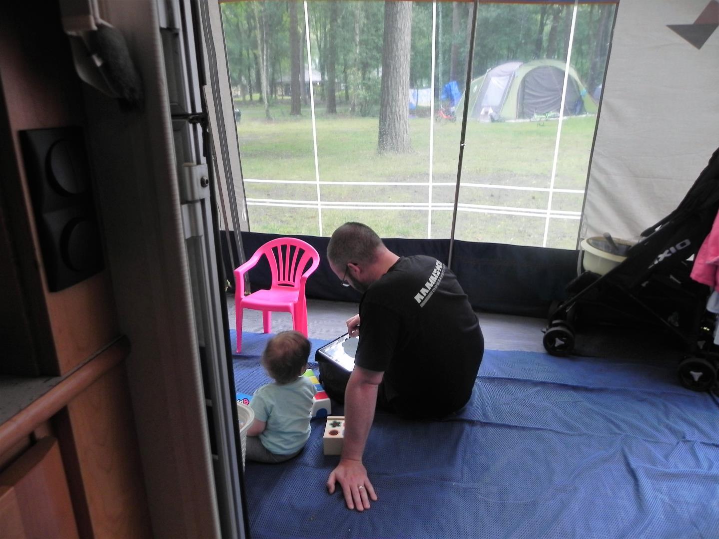 Regen! Dus dan maar in de voortent spelen. Wel heel fijn dat dat kon!