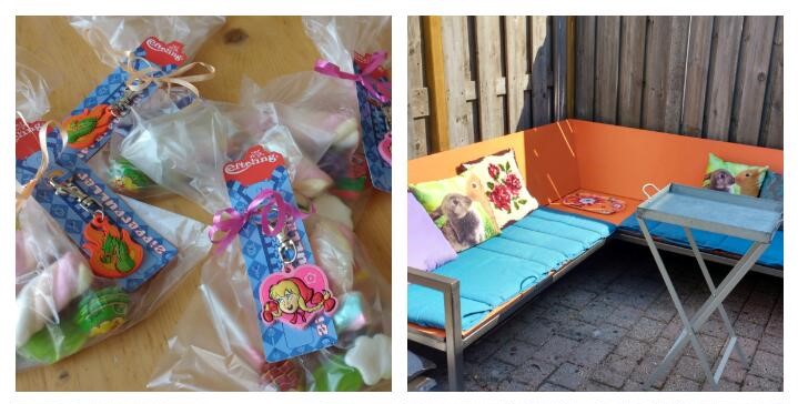 De voorbereidingen: snoepzakjes maken met een Efteling-sleutelhanger en dito kleurplaat voor de party-peuters. Een gezellig zithoekje voor de papa’s en mama’s met onze “Ibiza-bank” op rechts…