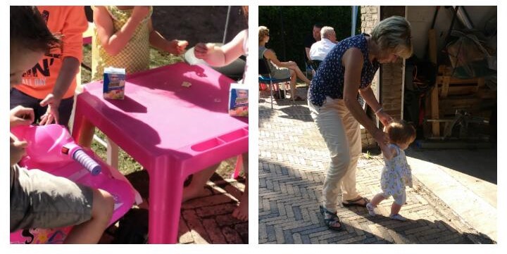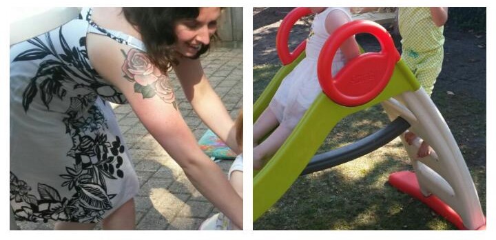 Ook zusje Lot van één moest geëntertaind worden en de glijbaan was bij de “oudere” kids een succes. Och ja, die valpartij… Natuurlijk was het er één van mij die eraf keilde. Van bovenaf ja. Noor viel flink hard door een te enthousiaste duw van een vriendje terwijl ze nog niet op haar billen zat. Aiii. Moeders lichtelijk in de paniekstand, maar gelukkig viel het alles mee.