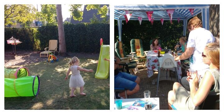 Ja, het werd een heuse peuter party. Het zit namelijk zo: Noor heeft (nog) geen neefjes of nichtjes om haar verjaardag mee te vieren en dat vonden we zo jammer! Ze wilde graag een feestje vieren dus we combineerde het “grote-mensen-feest” met een klein kinderfeestje. Noor wist ook precies welke kindjes ze uit haar groep van de kinderopvang voor haar feestje wilde uitnodigen. Het was een bescheiden aantal van vijf kindjes, prima vond ik! We maakten uitnodigingen (wat al een heel feest op zich was) en de peuter party was in zicht! Niks geks: lekker veel speelhoekjes in de tuin, zandbak en glijbaan erbij, K3-muziek op en gaan! De papa’s en/of mama’s nodigden we ook uit voor een kop koffie tijdens het feestje, die vonden het ook erg leuk!