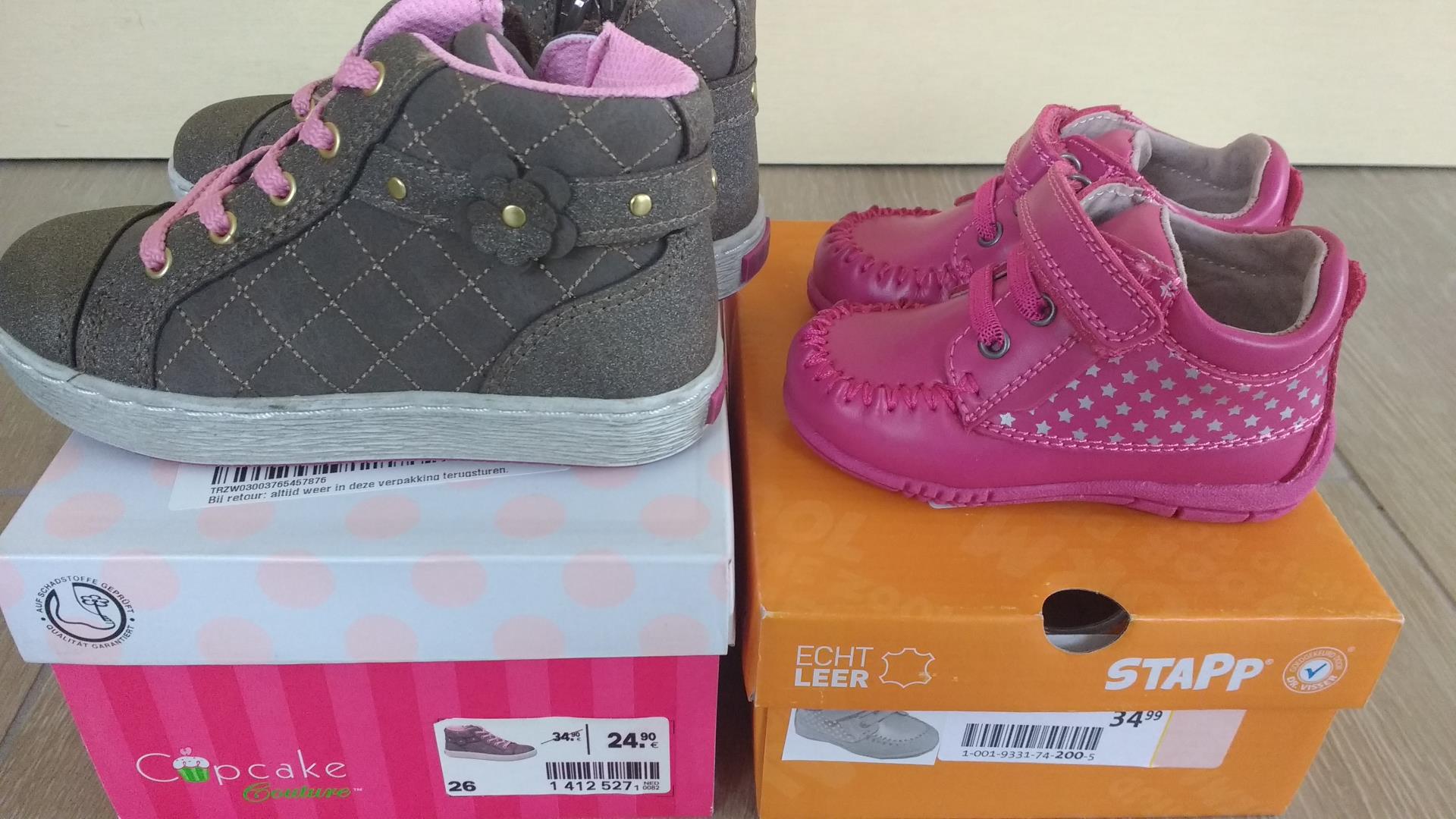 Kijk hoe leuk! De schoenen links (merk: Cupcake Couture) in maat 26 bestelde ik dus later ook een maatje kleiner in het donkerblauw en ze kosten nu €24,90. Echt een prima prijs en hele mooie, stevige schoenen! Ze zijn makkelijk aan en uit te doen omdat er een rits aan de binnenkant zit en omdat het een halfhoog model is staat het heel stoer onder een legging. De schoentjes voor Lot (merk: Stapp) waren wat duurder (€34,99) maar ik was er meteen verliefd op! Ik bestelde ze in maatje 20 en ze zitten echt perfect. Ze kan er goed mee stappen, de schoentjes zijn niet te zwaar aan haar voeten en ze blijven goed zitten.