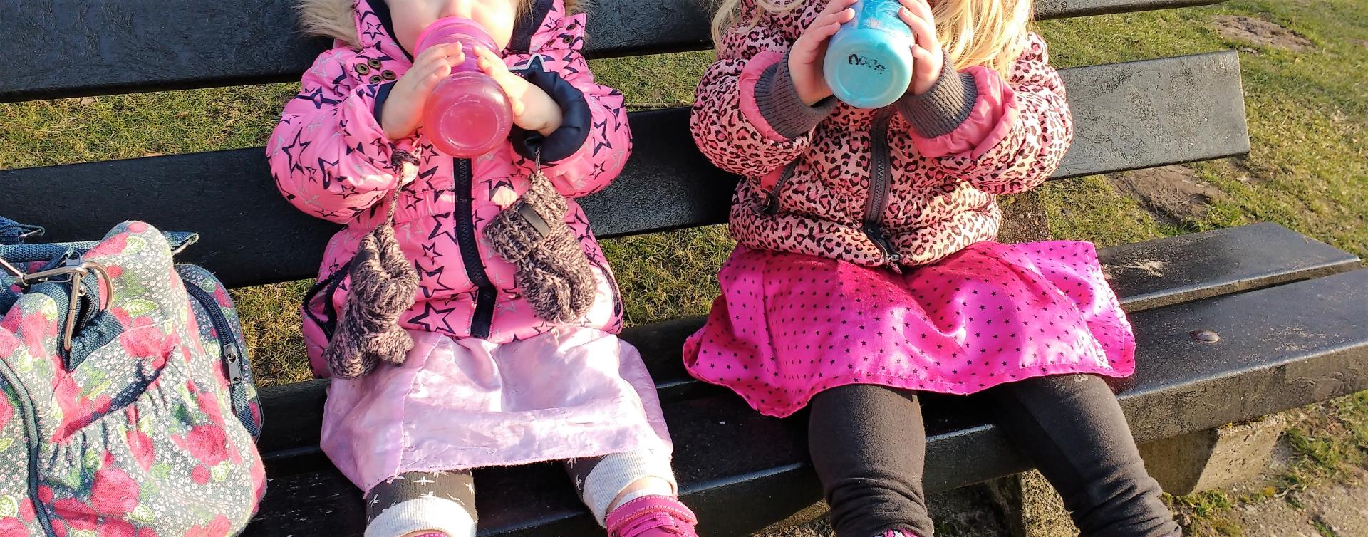 Na het spelen in het zonnetje lekker even uitrusten op een bankje met wat drinken en een verantwoord koekje 😉