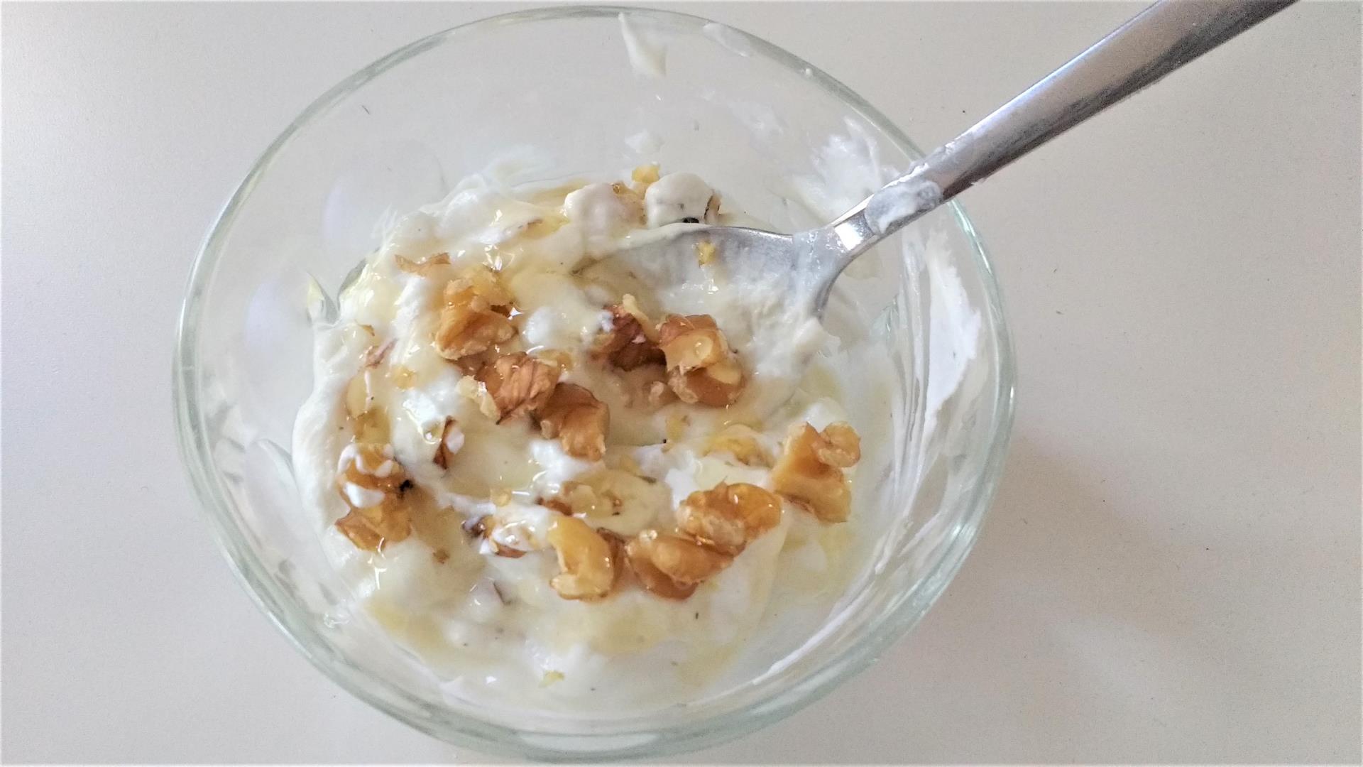Even ontbijten met skyr (eiwitten!!), walnoten en honing, hmm.