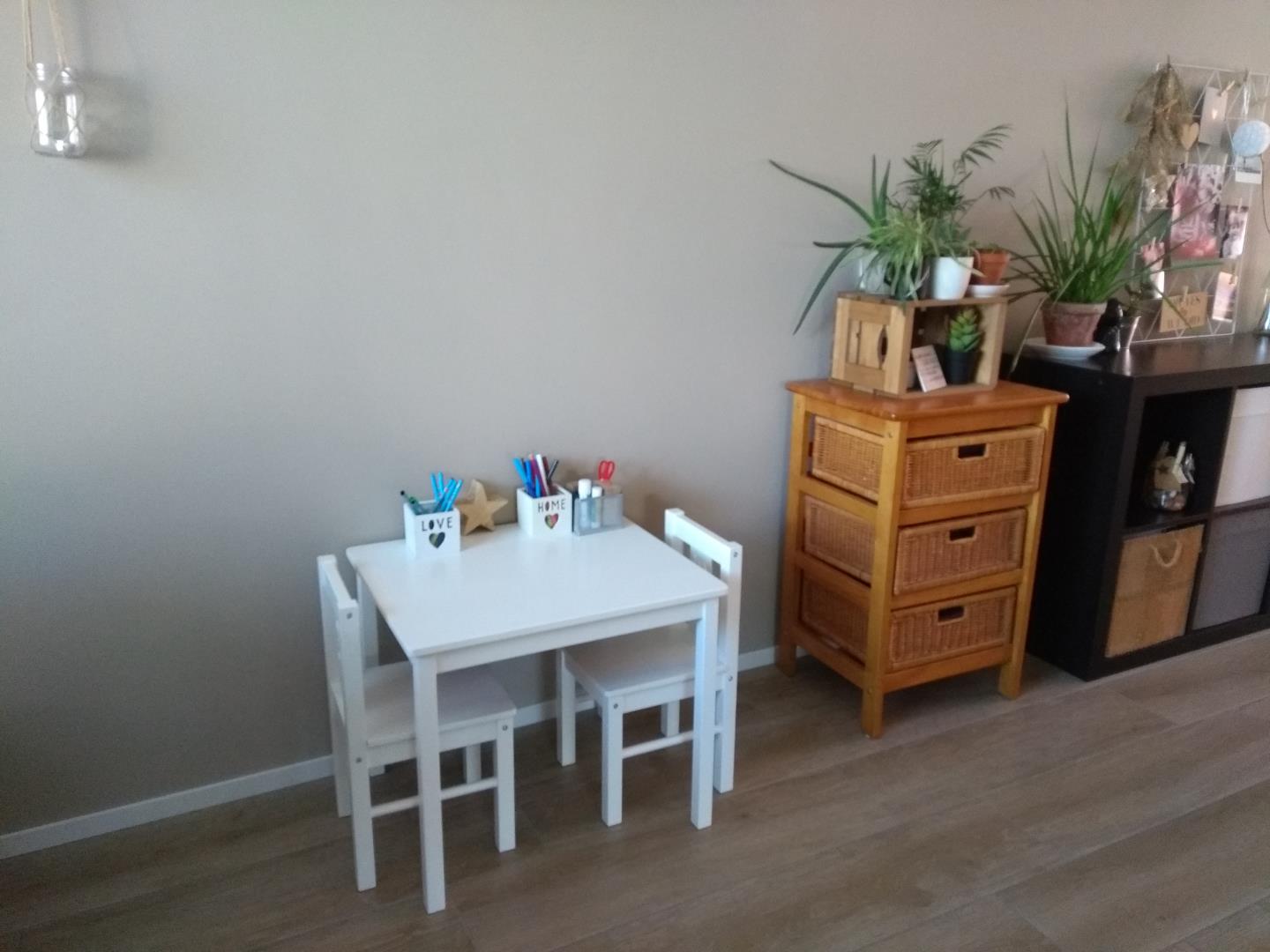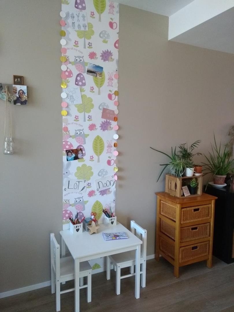 Eerst zocht ik een fijne plek uit en dat werd naast de eettafel. Zo zitten de meiden tussen de woonkeuken en woonkamer in en kan ik ze vanuit de hele kamer in de gaten houden 😉 Eerst stonden hier een grote plant en een tafeltje met mijn plantenkistje. Die ik heb omgewisseld voor een oud ladekastje dat ik nog op zolder had staan en een tafel en stoeltjes van Ikea. Dat is eigenlijk de hele basis natuurlijk want meer heb je niet nodig. Maar: het kan ook anders!