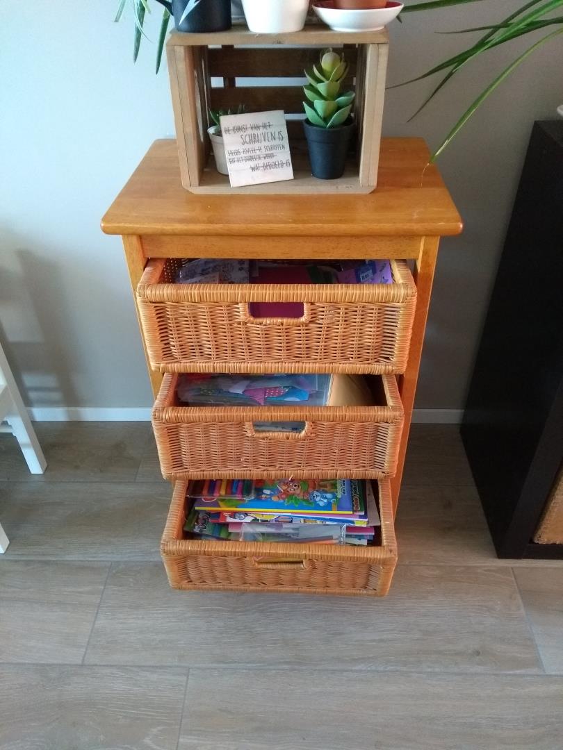 In het ladekastje stopte ik alle kleur- en knutselspullen zodat de meiden die zelf kunnen pakken (en opruimen!). Handig! Geen rondslingerende kleurboeken meer hier 😉