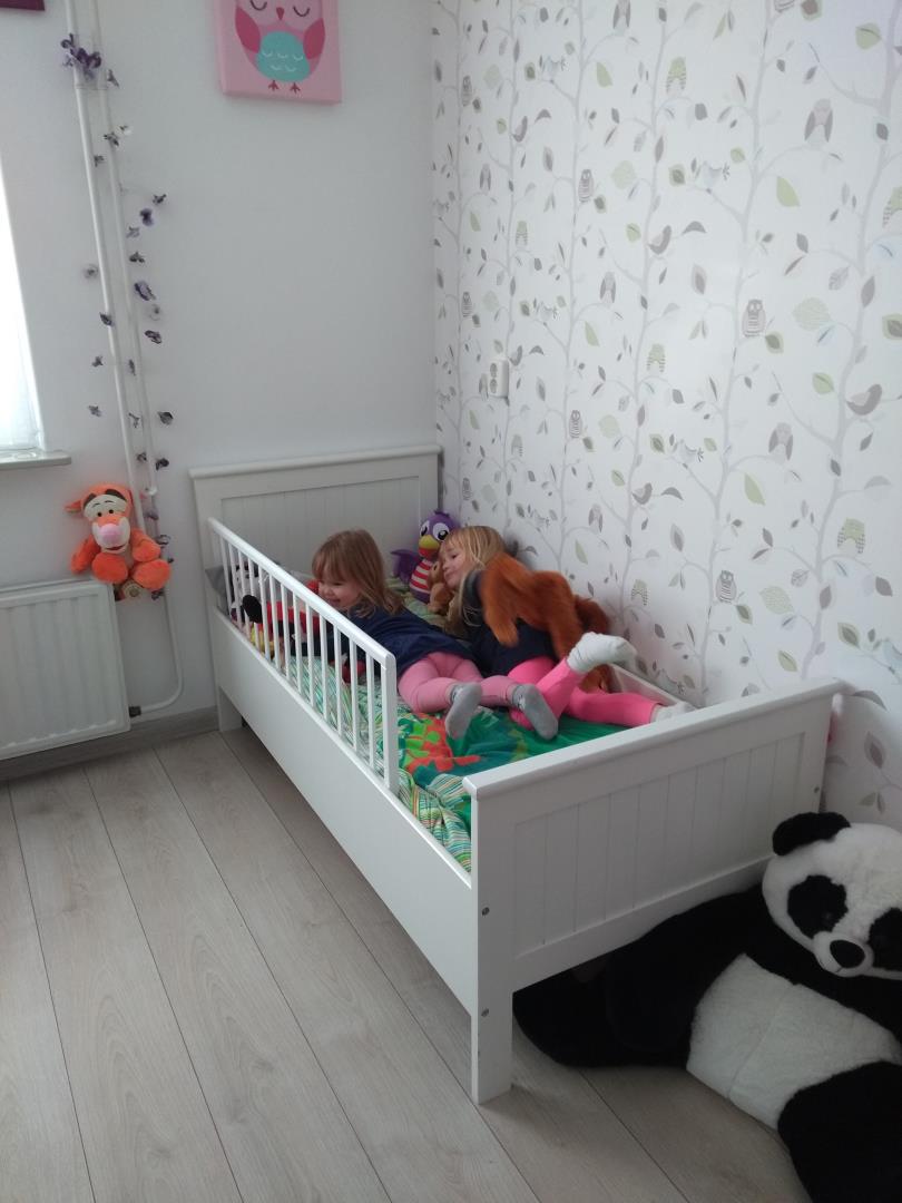 Jaaa, ze doet het super goed in haar nieuwe bedje! Ze laat helemaal trots aan haar oudere zus haar nieuwe bed steeds zien en stouwt het vol met knuffels. Heerlijk! Zo leuk om te zien. En helemaal wijs natuurlijk dat ze er nu zelf in en uit kan maar gelukkig doet ze dat ’s avonds (en ’s ochtends) niet! Ze blijft netjes liggen. Voor nu dan… Lot werd wel de eerste paar nachten in haar nieuwe bed een paar keer huilend wakker, ik denk gewoon omdat ze dan half wakker werd en normaal verder zou slapen maar nu wat gedesoriënteerd was.