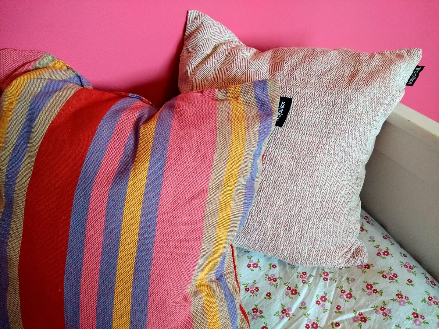 Ik stylde de kamer met leuke accessoires zoals de vrolijke kussens van Tropilex. Zij zijn specialist in mooie zomerse hangmatten en accessoires. Alles is gemaakt van stevig, degelijk materiaal. Perfecte kussens die wel tegen een stootje kunnen dus π Ook de hanging chairs die ze hebben vind ik zo gaaf en zouden helemaal in onze nieuwe overkapping passen. Want de tuin verbouwen: dat wordt ons volgende project!