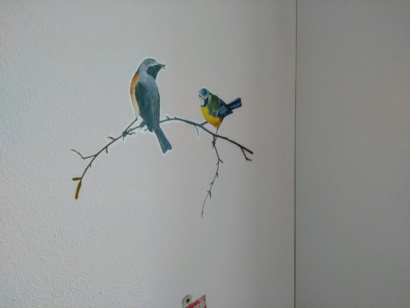 Dit was de oude kamer van Noor. Maar nadat we Noor naar haar nieuwe kamer op zolder hadden gebonjourd, was het (vooral voor dit behang) time to go… (Het ledikant was natuurlijk allang vervangen door een peuterbed voor Noor destijds maar dit is even een oude foto)