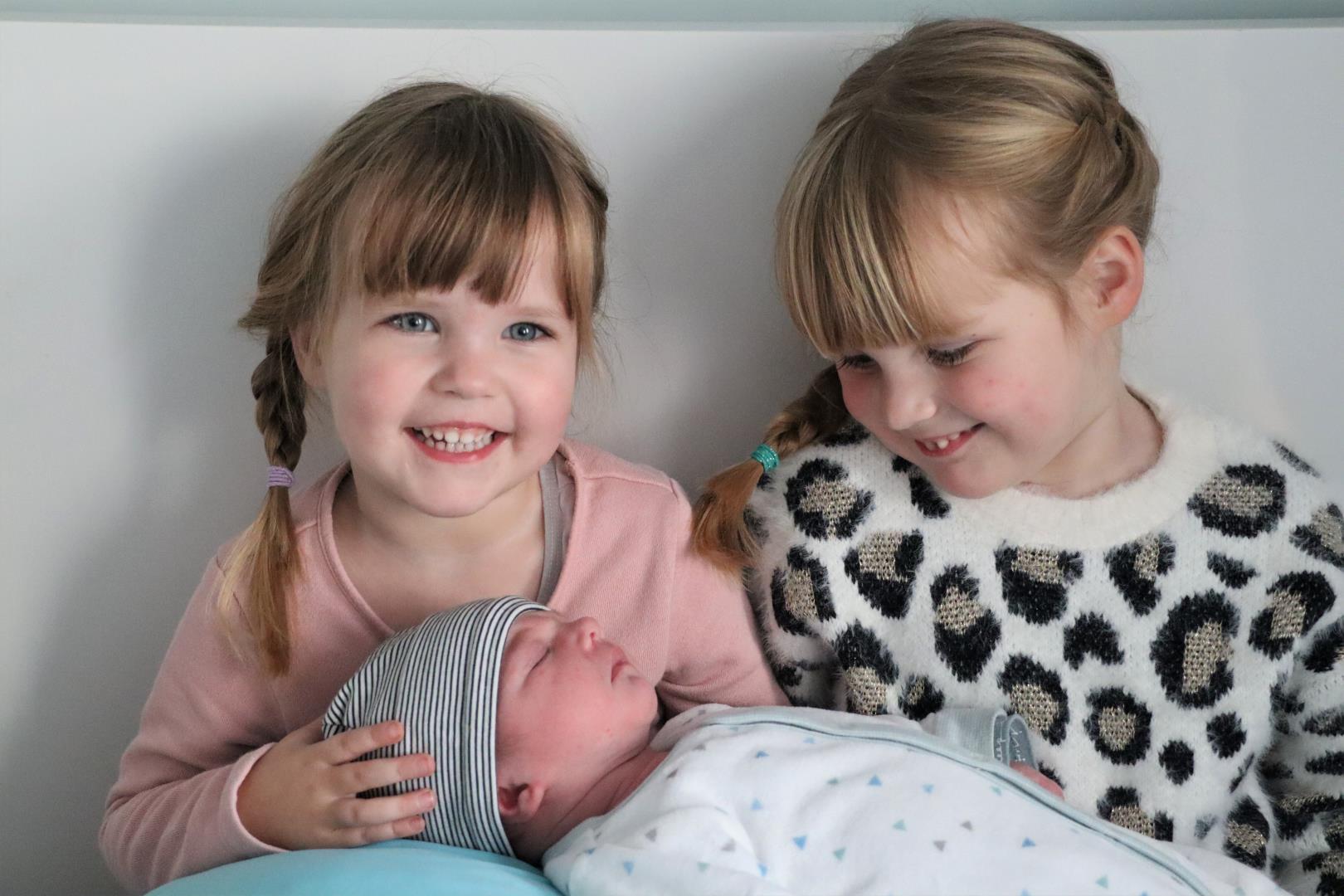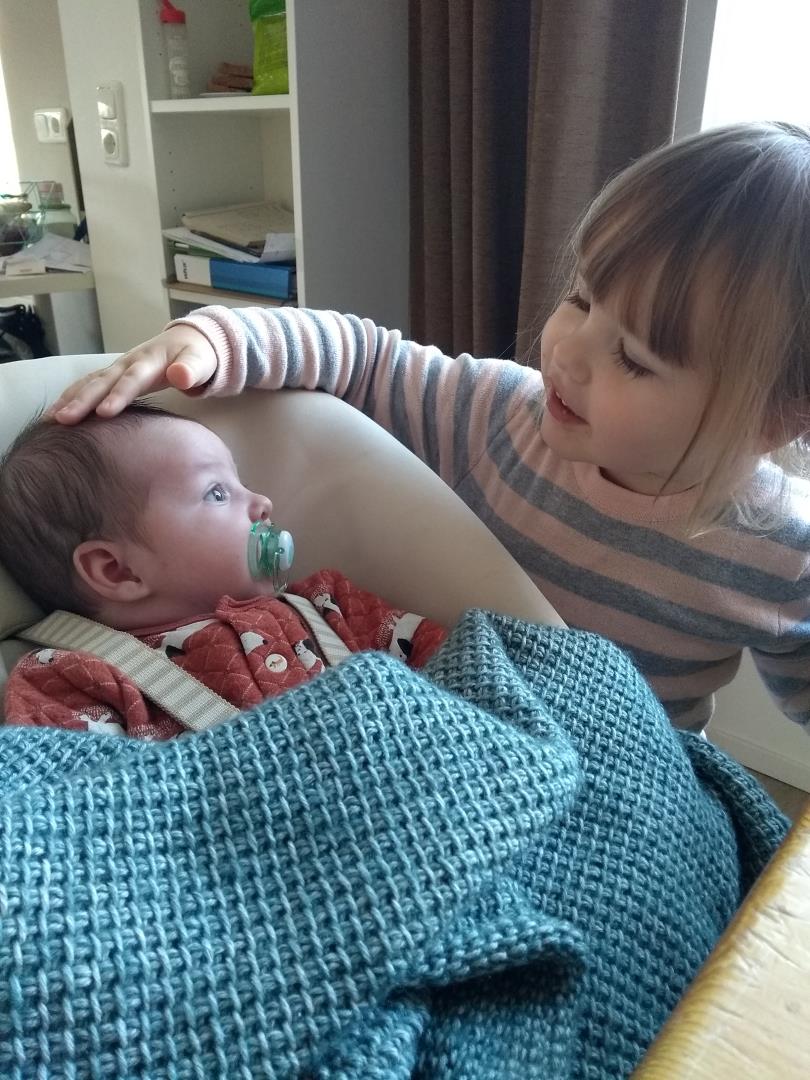 Ze zijn heel zuinig op hun broertje en zijn voorzichtig als ze hem aanraken. Wat dat betreft is het ideaal dat ze deze leeftijden hebben (Noor is 5 en Lot is 3) want ze begrijpen alles heel goed. Ook wanneer ik echt even een moment met Ben nodig heb dan leg ik dat uit en snappen ze dat. Ze trekken zich samen even terug met een spelletje of gaan aan hun bureautje zitten kleuren. Lieve meiden. Ze zijn echt gek op Ben en dat straalt er vanaf. Wat geniet ik van al die grote zussenliefde die ze hem geven!