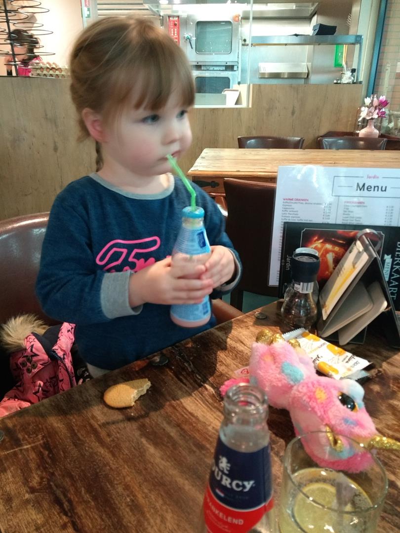 Met gloeiende oortjes stapte we nog even ergens binnen voor een Fristi. Zo leuk om even één op één tijd te hebben en dit samen te kunnen doen. En dat zelfs twee keer want bij één van de oorbellen zat de achterkant blijkbaar niet goed. Met het zetten bleef het pistool ook een beetje hangen(!!) dus toen had ik al zoiets van “Wat was dat?” maar het leek allemaal goed te zijn gegaan. Niet dus. De volgende ochtend zagen we bij ontsmetten dat de oorbel met de hartjes los zat bij Lot. Zo sneu! Hij hing er half uit en het achterkantje was nergens te vinden. Ik mocht er ook niet aanzitten want ondertussen vond ze het echt niet leuk meer. De oorbel heb ik er toen voorzichtig verder uitgehaald en belde de juwelier waren we waren geweest.