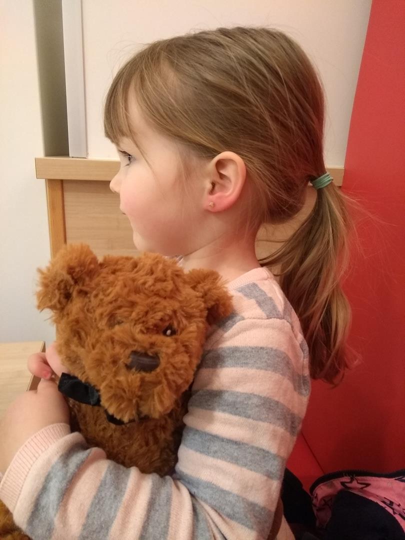 Drie weken later gingen we terug. Lot vond het geen probleem om haar ene oorbel nog eens te laten zetten. We werden super lief geholpen door dezelfde dame. Ze was de eerste keer ook al zo weg van Lot en nu kreeg ze een gloednieuwe beer van haar en hoefde ik niets af te rekenen. Heel netjes! Het zetten ging goed en natuurlijk nam ik Lot erna weer mee voor iets lekkers π