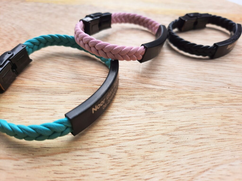 Een absolute musthave met kids: SOS naambandjes! Zeker in de zomer kan ik niet zonder. Zo kan ik toch echt net een tikkie relaxter op de camping zitten of een dagje weg gaan. Het is een veilig gevoel dat de kinderen een bandje om hebben met hun naam en mijn telefoonnummer erop, want echt: stel dat…
