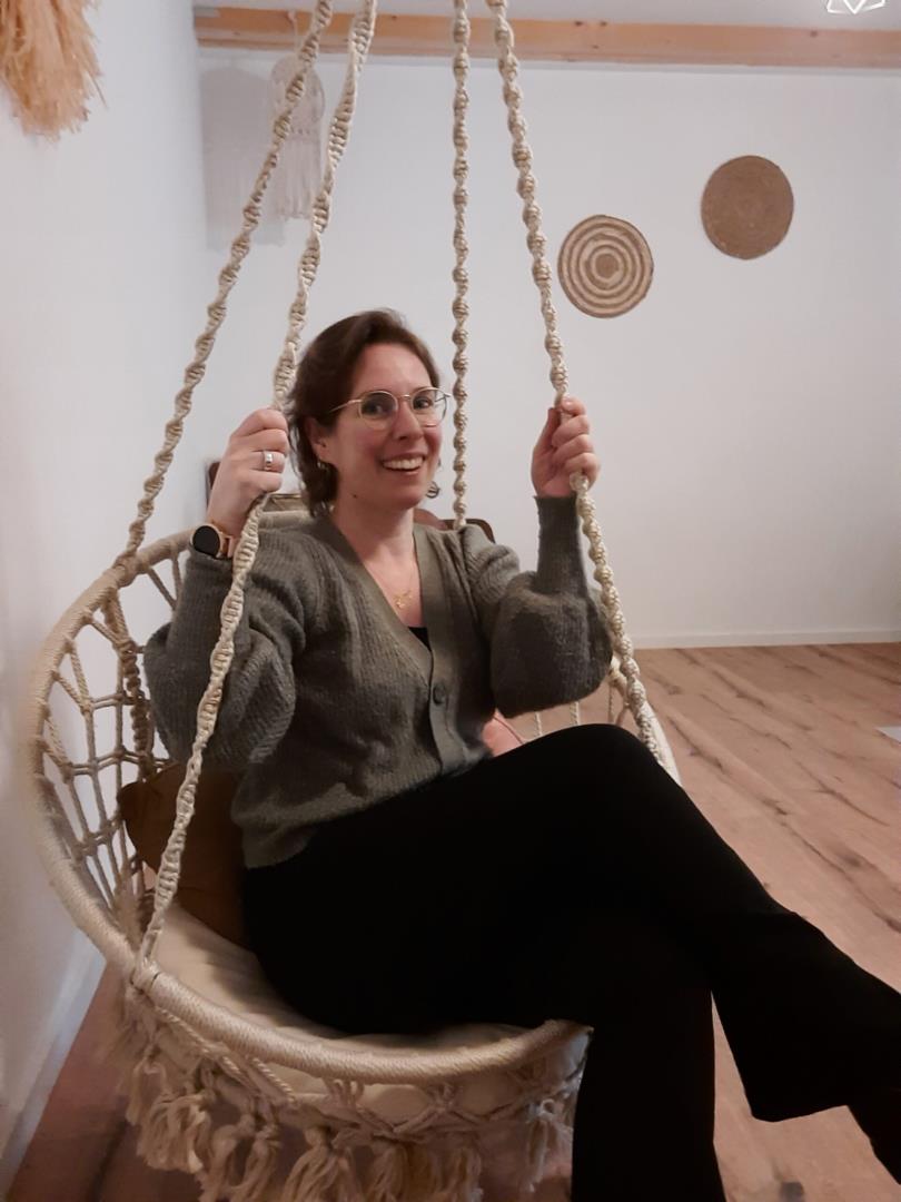 En wat ook helemaal fijn is: in de zomer kan ik mijn hangstoel ook onder overkapping hangen. Door daar een extra bevestigingshaak op te hangen is het straks ook heerlijk om buiten te genieten in de stoel. En omdat hij zo makkelijk op te hangen is, kan ik ‘m ook snel vanuit de studio verplaatsen wanneer ik de ruimte nodig heb voor een vrouwencirkel. Of een kinderfeestje 😉