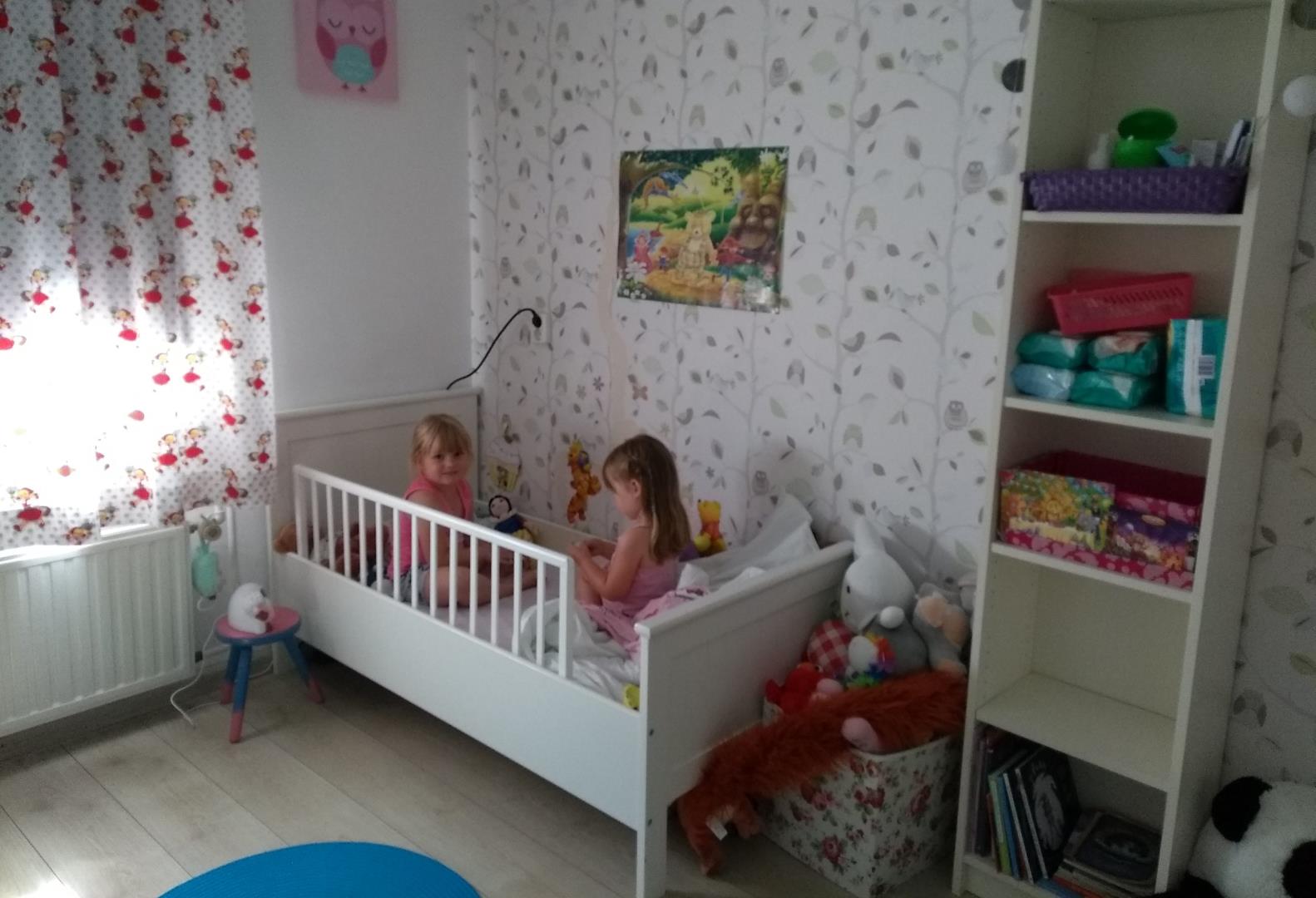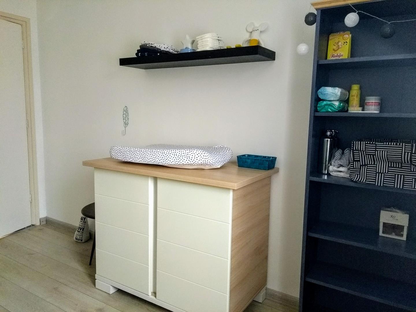Het behang ging dus als eerste van de muur af en deze verfde we in dezelfde kleur als de muur in onze woonkamer. Ik koos voor een lambrisering van 140cm hoog. De meubels van de babykamer hadden we nog dus deze hebben we gewoon weer gebruikt. Alleen de donkerblauwe kast is nieuw op deze kamer. Het is een oude boekenkast van mijn tienerkamer in het ouderlijkhuis die we eigenlijk weg wilden doen, maar hij zag er nog zo goed uit en ik kwam kastruimte tekort op de babykamer dus zette ik ‘m hier neer.